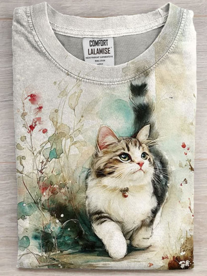 Cute Fat Cat Art Print Casual Short Sleeve T-shirt