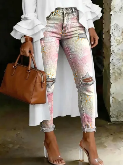 Cute Floral Casual Printed Ripped Skinny Jeans