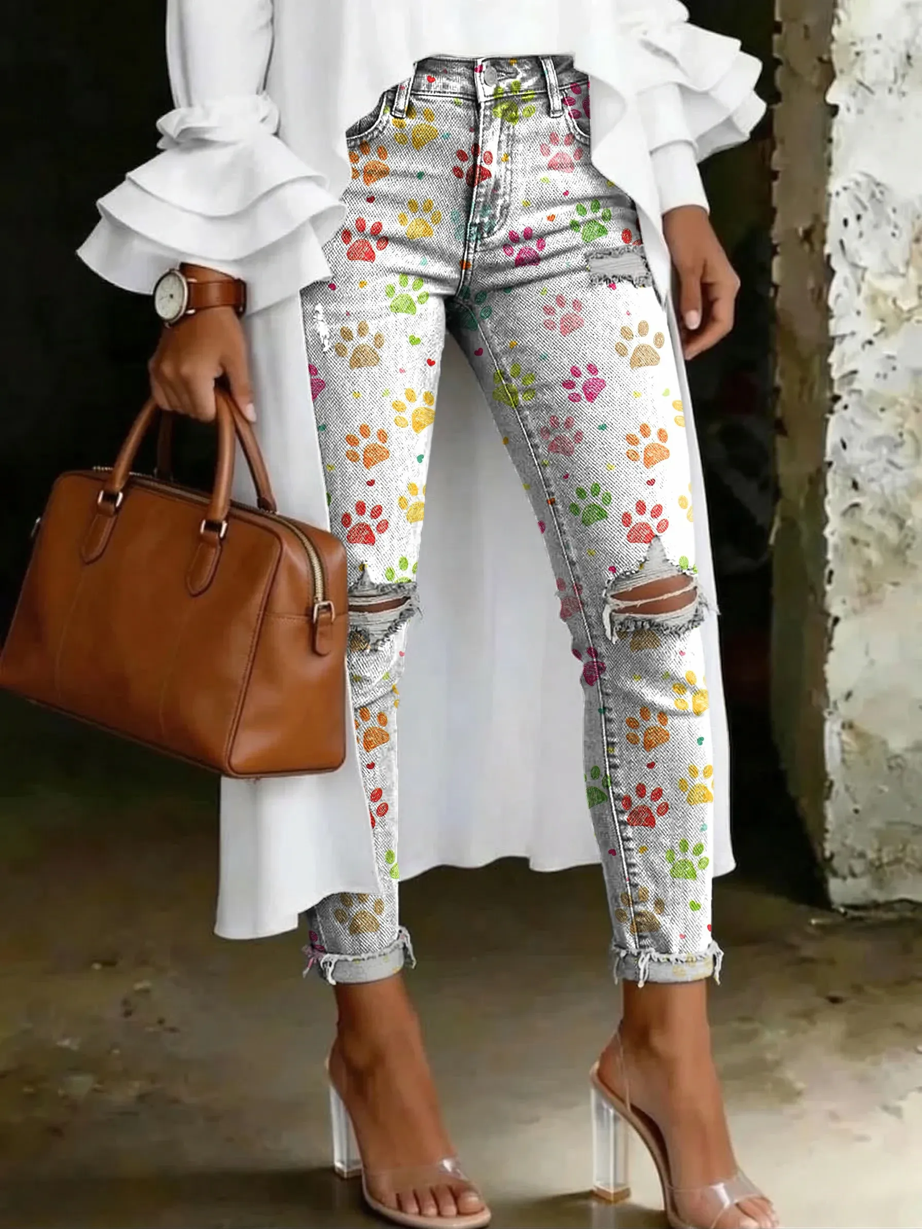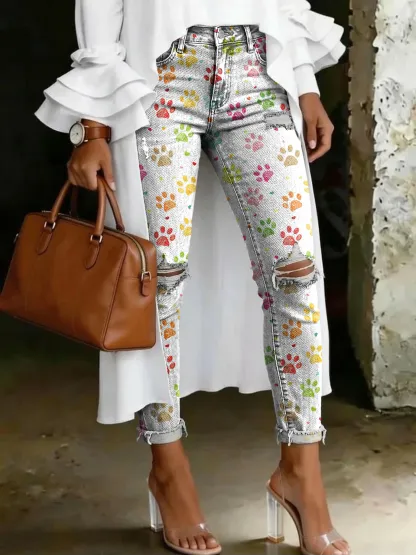 Cute Paw Print Heart Pattern Art Print Casual Ripped Skinny Jeans