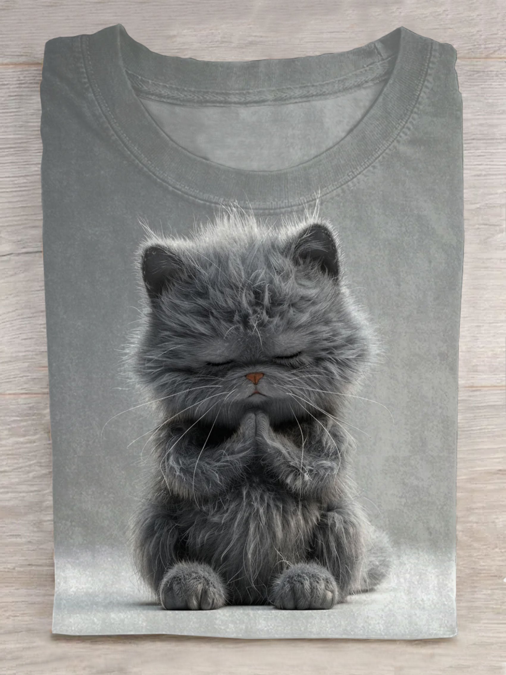 Cute Praying Fluffy Cat Art Print Casual Short Sleeve T-shirt
