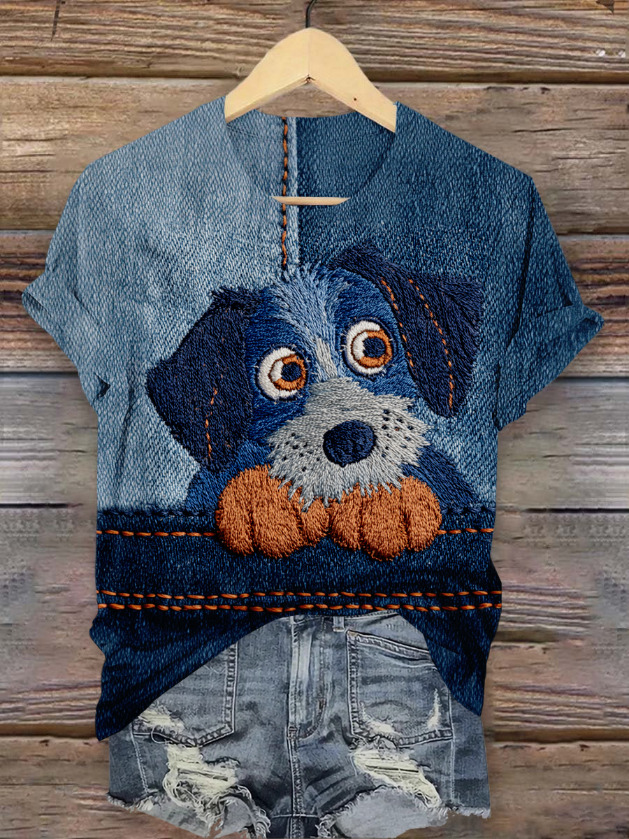 Denim Dog Art Print Casual Short Sleeve T-Shirt