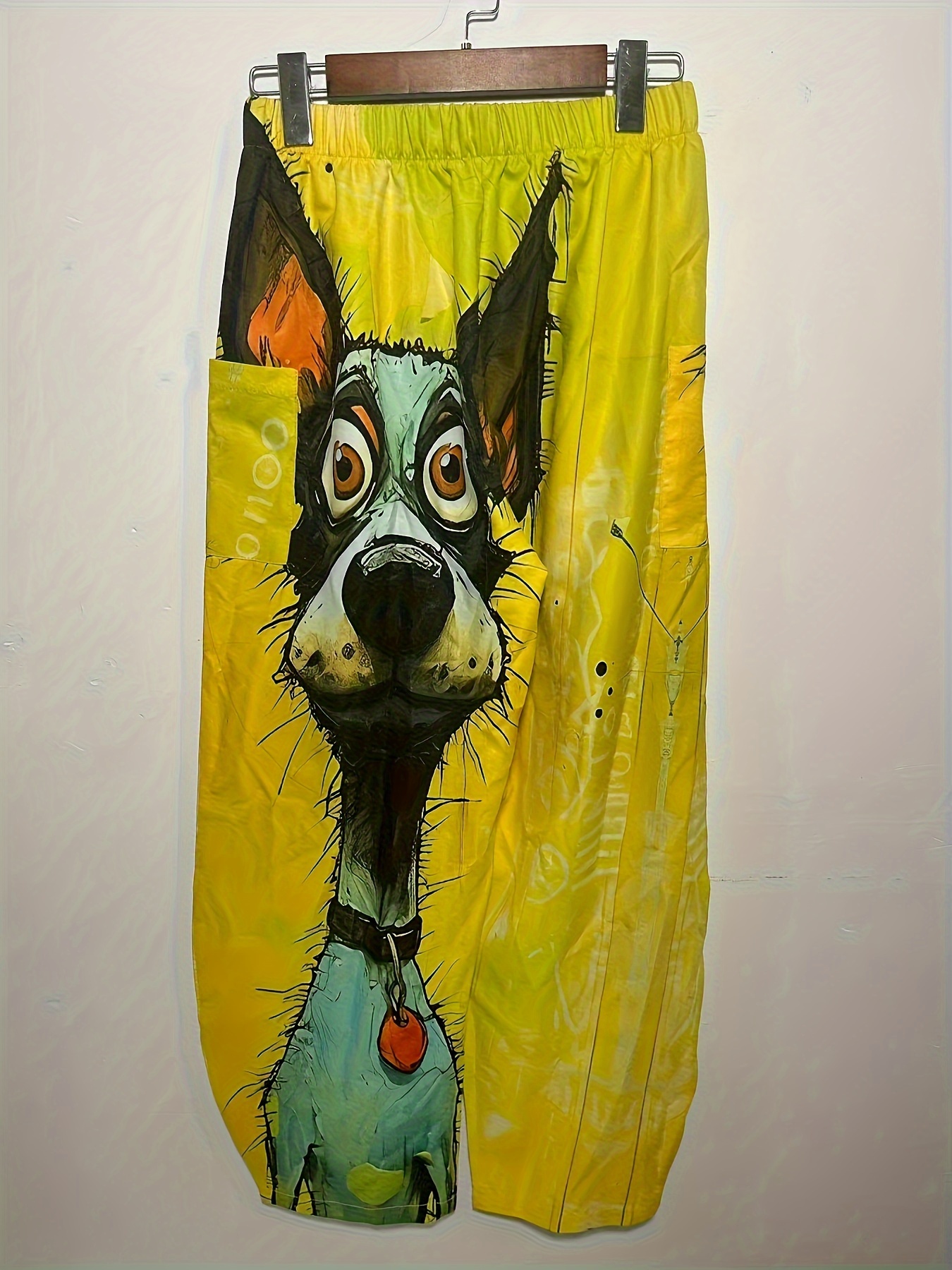 Dog Print Elastic Waist Pants, Casual Wide Leg Patched Pockets Pants, Women's Clothing