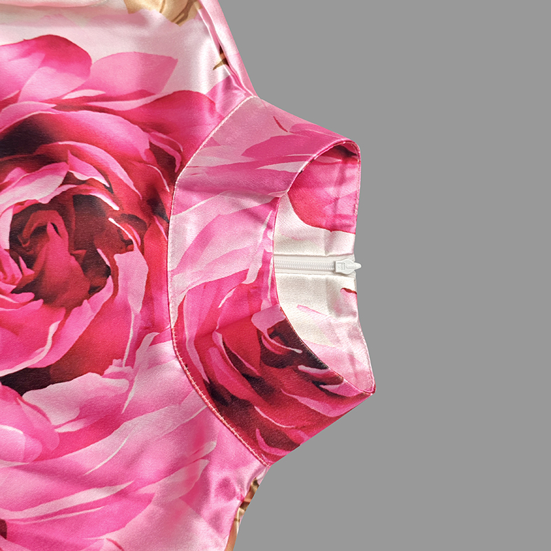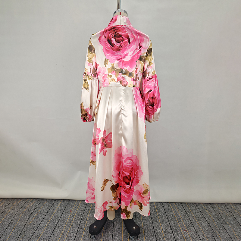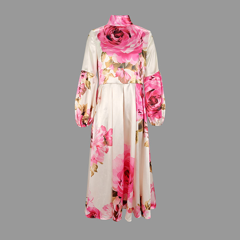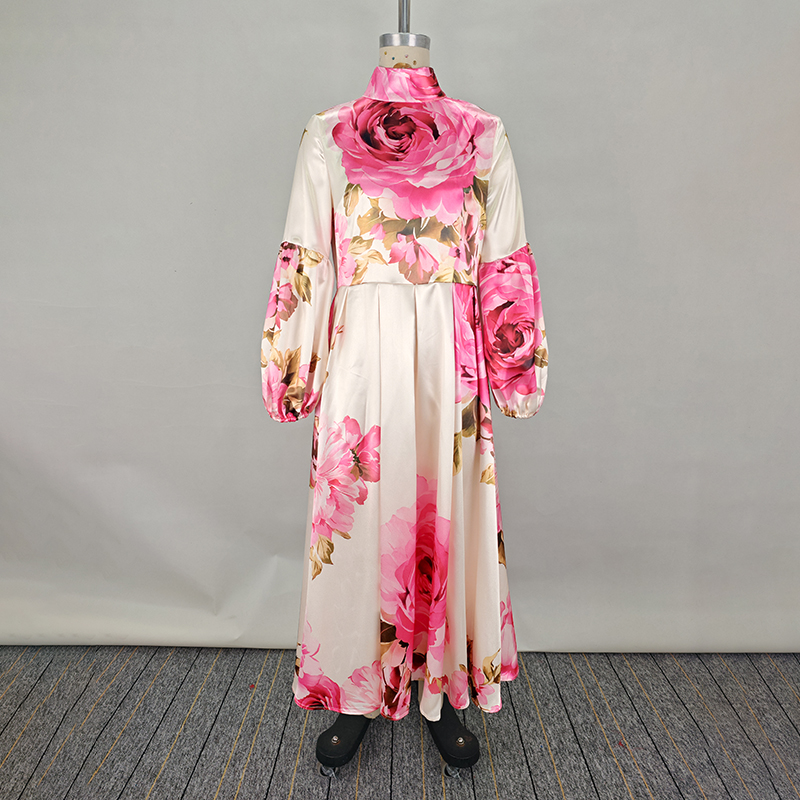 Elasticity Flower Print Pleated A-Line Long Sleeves Mock Neck Maxi Dresses