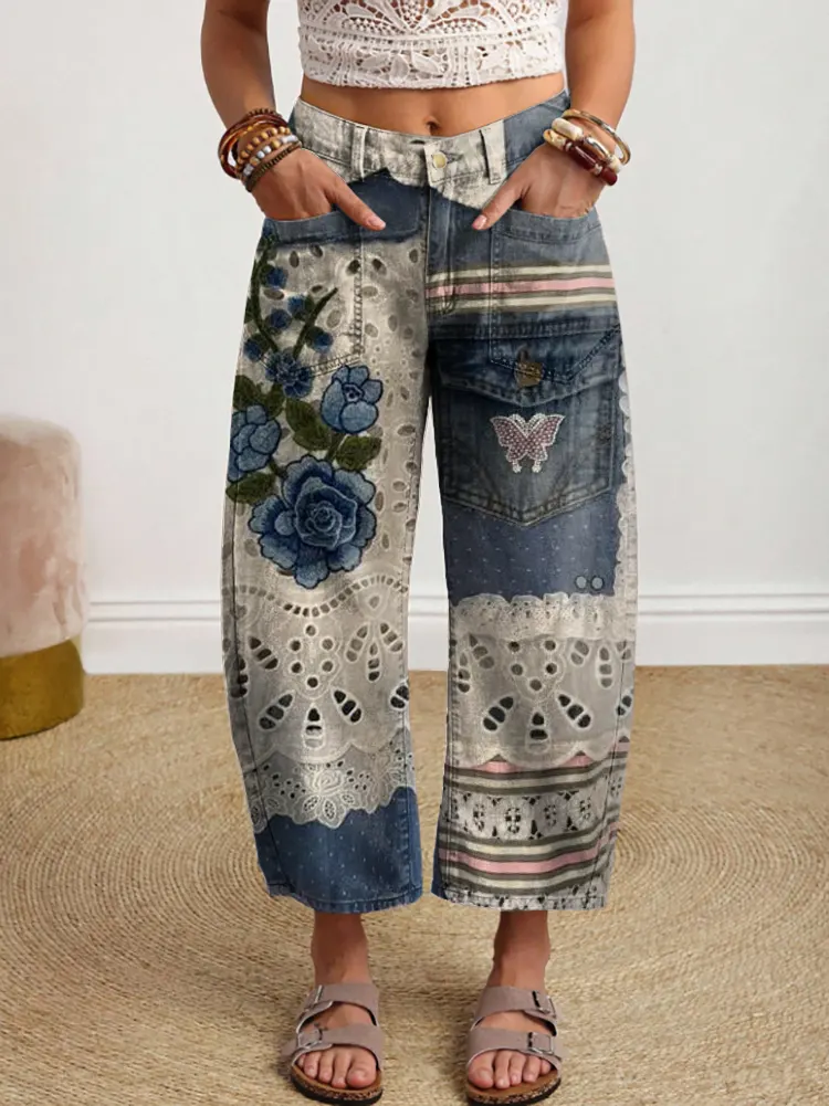Ethnicity Patchwork Flowers Butterfly Women's Art Print Jeans – lolonb