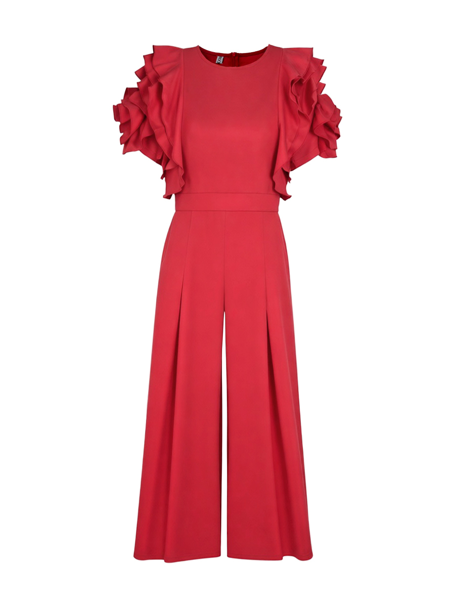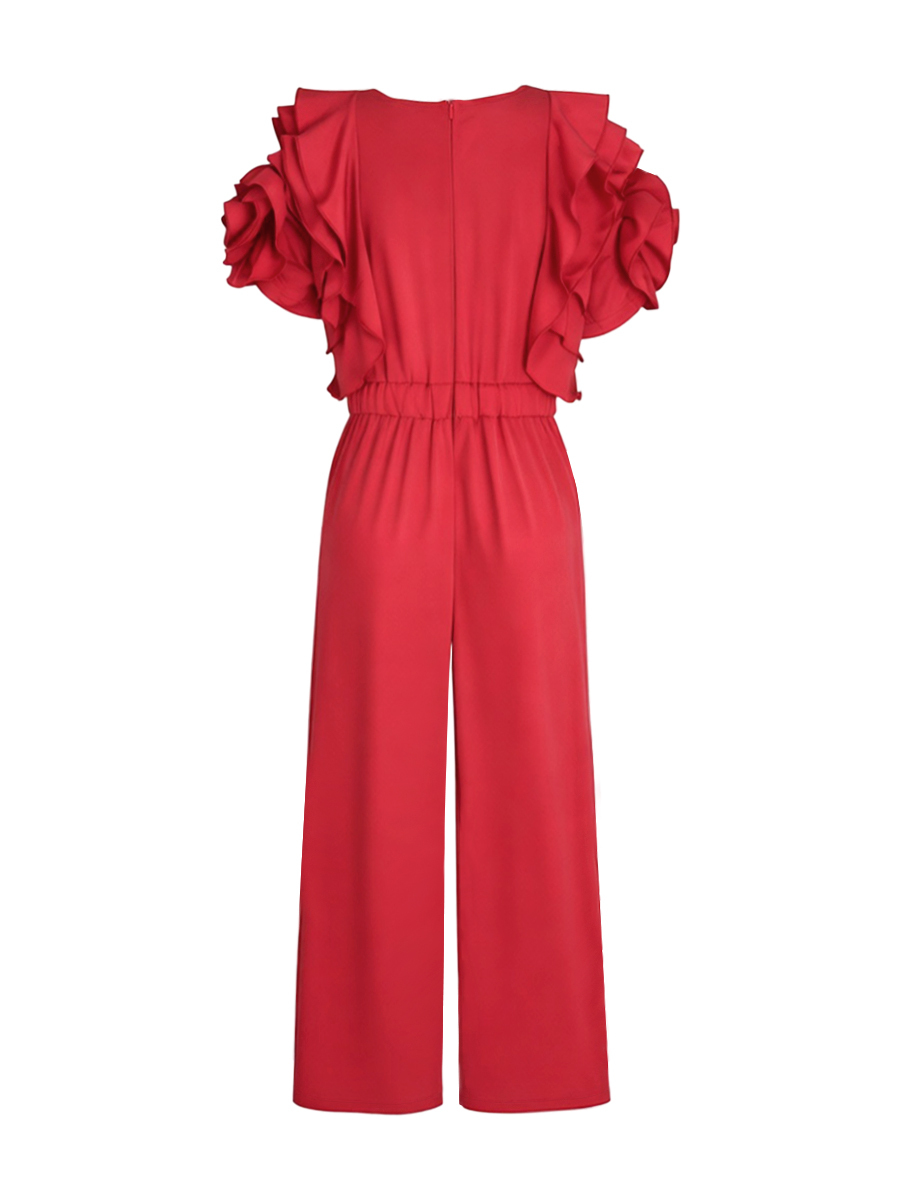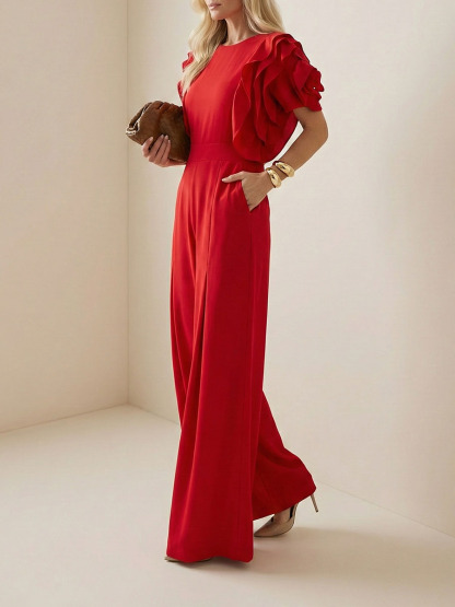Falbala Solid Color Loose Short Sleeves Round-Neck Jumpsuits