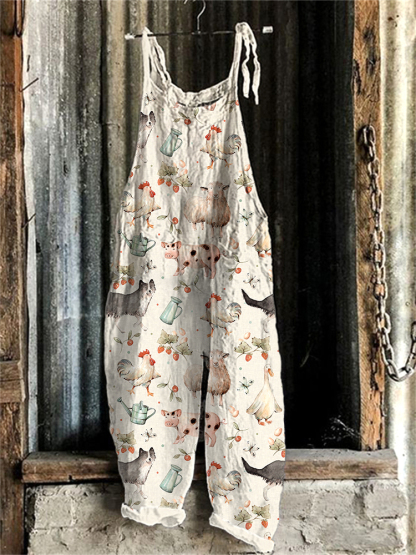 Farm Animal Print Linen Blend Casual Jumpsuit