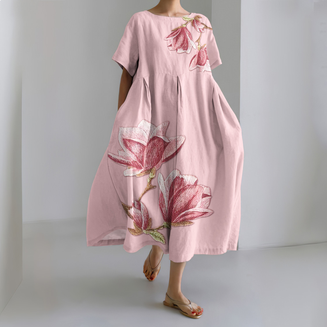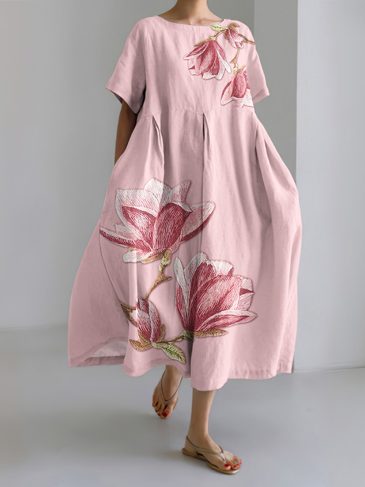 Fashion Blossom Print Crew Neck Linen Blend Dress – lolonb