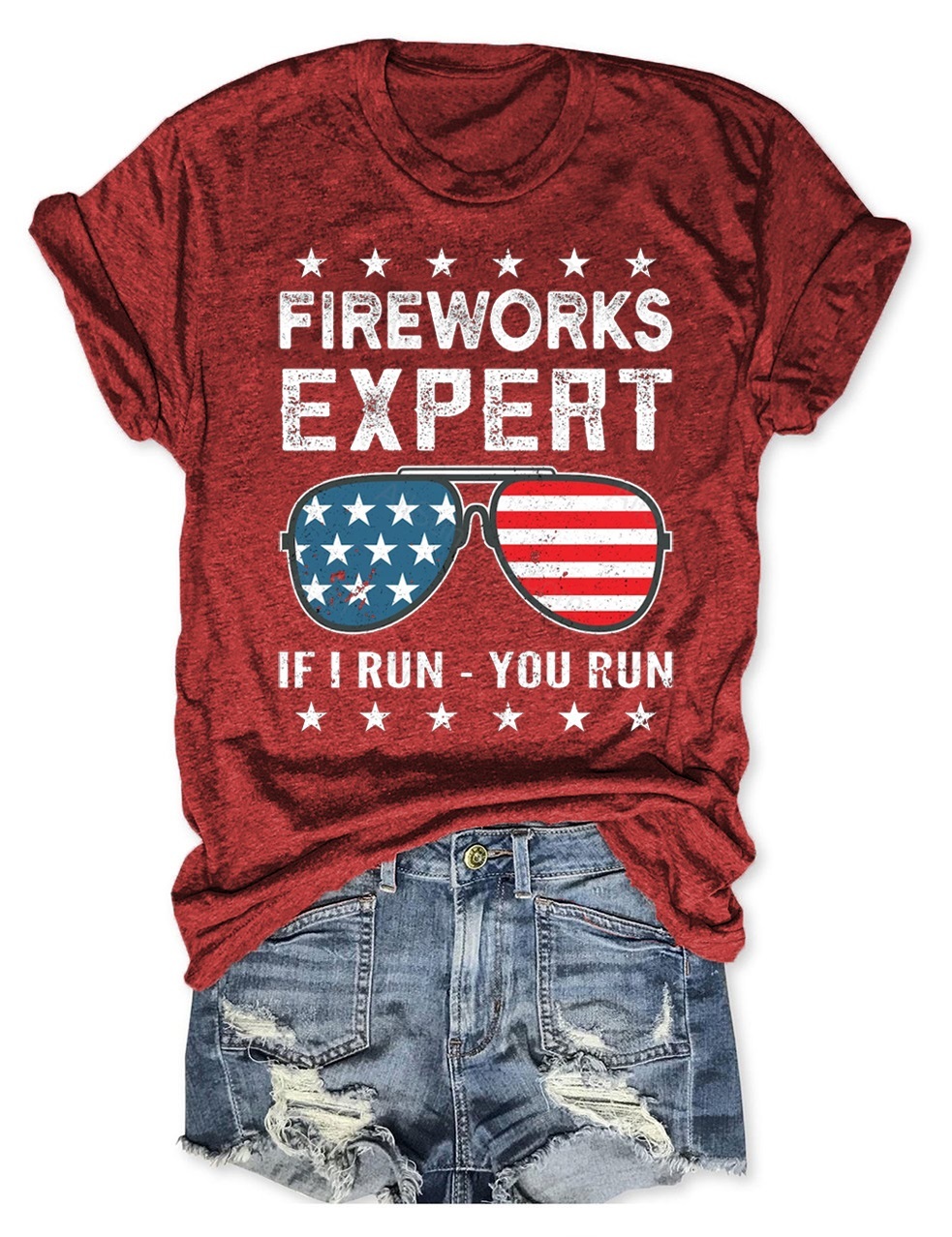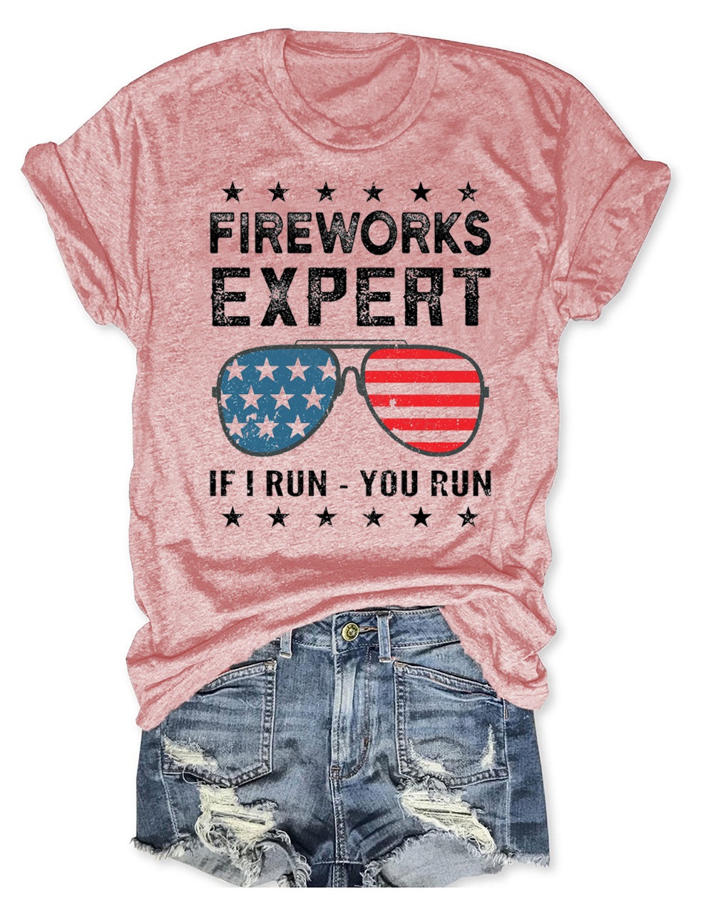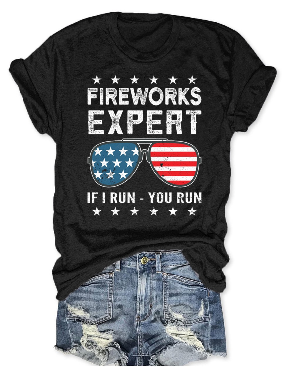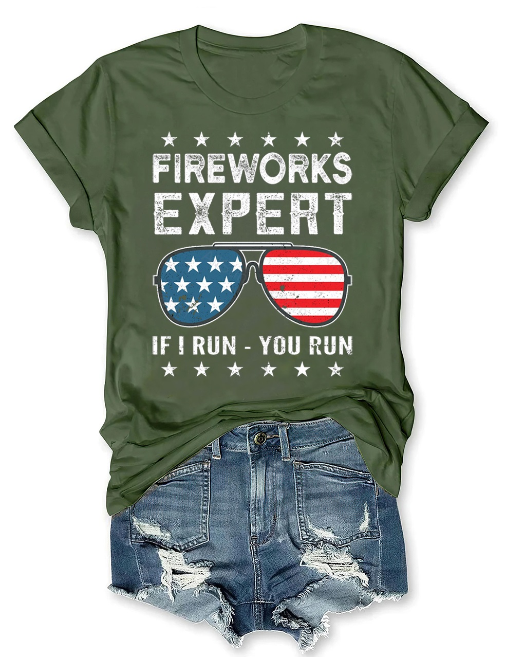 Fireworks Expert If I Run You Run American Flag Sunglasses T-Shirt