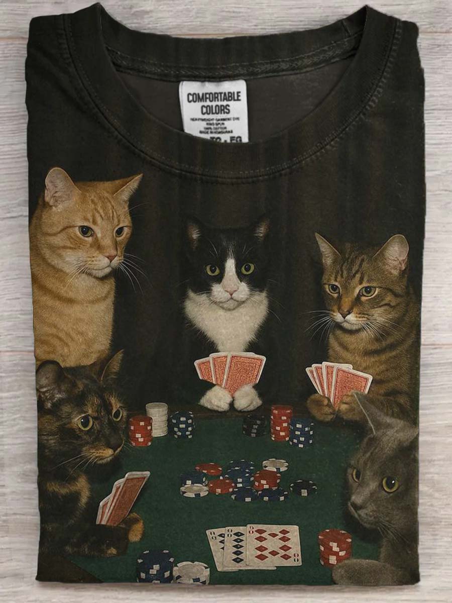 Funny Cat Playing Cards Printed Casual Short Sleeve T-Shirt