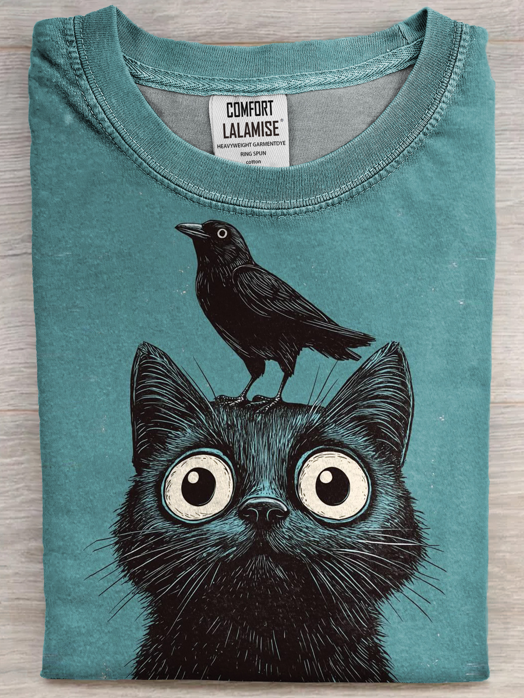 Funny Crow And Cat Art Print Casual Short Sleeve T-shirt