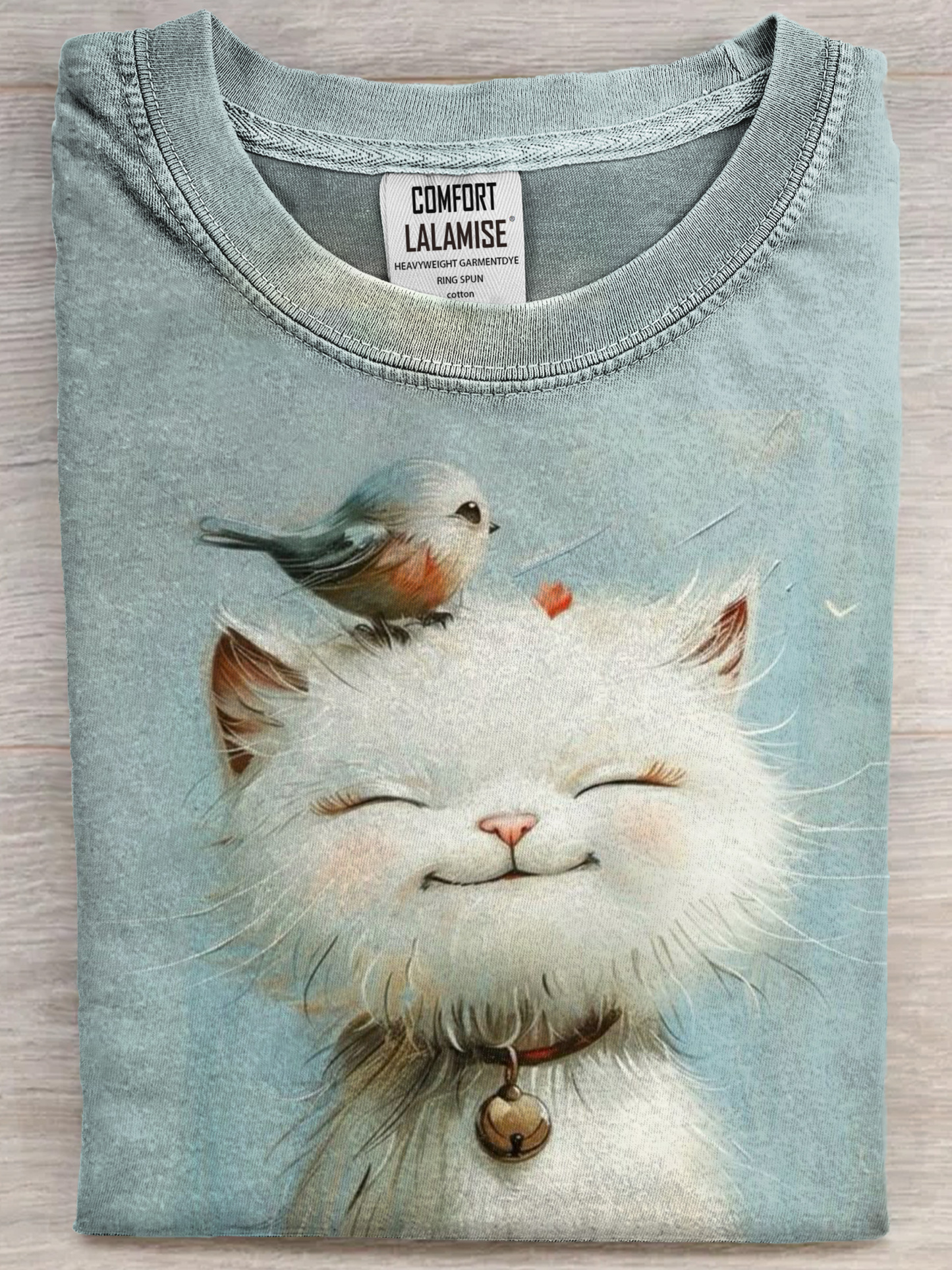 Funny Cute Bird And Cat Art Print Cotton Casual Short Sleeve T-shirt