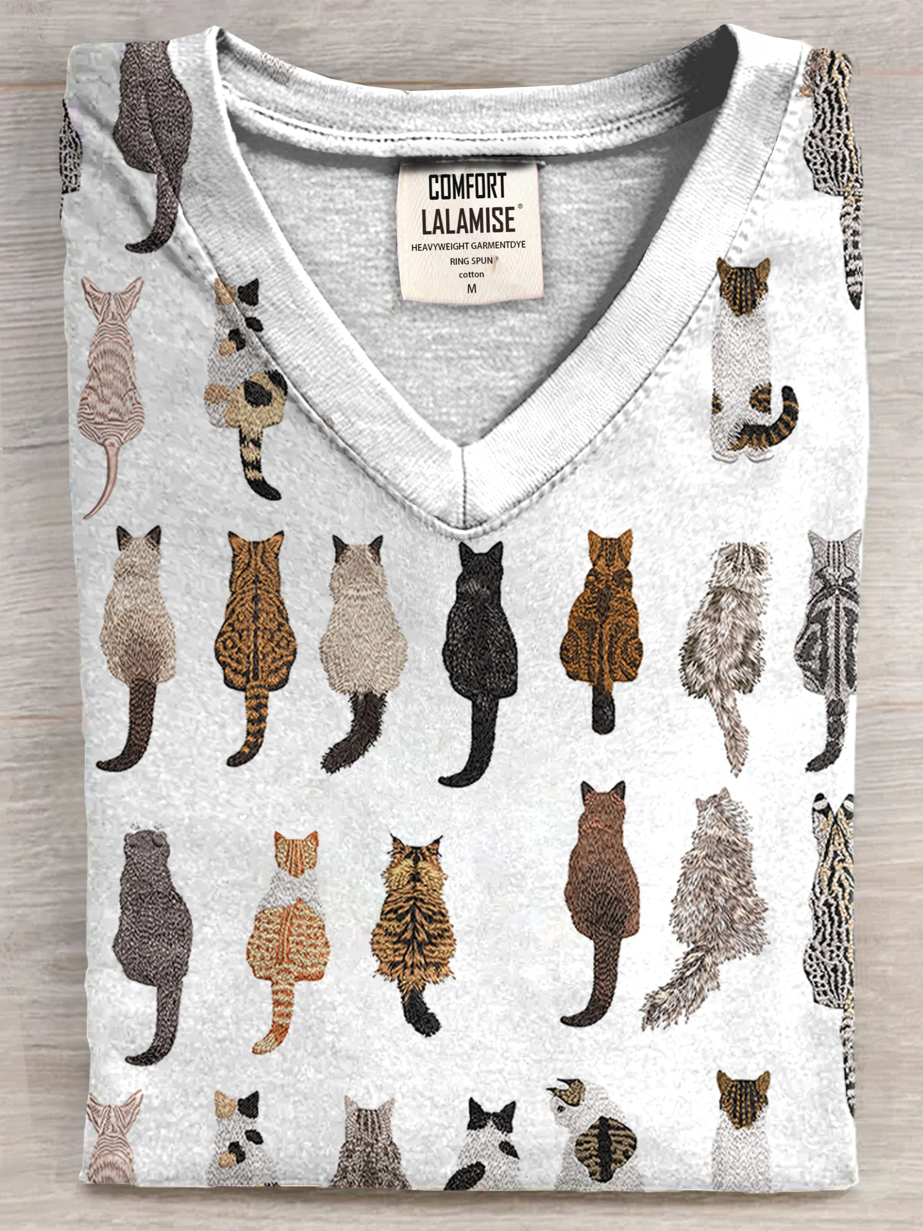 Funny Cute Cat Art Print V-neck Casual T-shirt