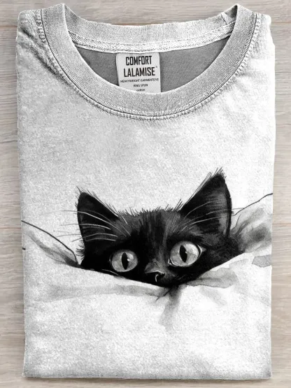 Funny Retro Black Cat Art Print Casual Cotton Short Sleeve T-shirt