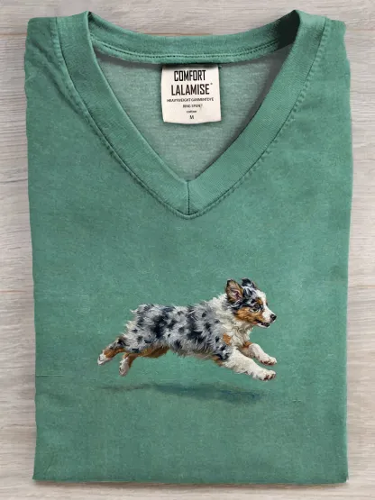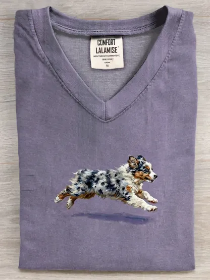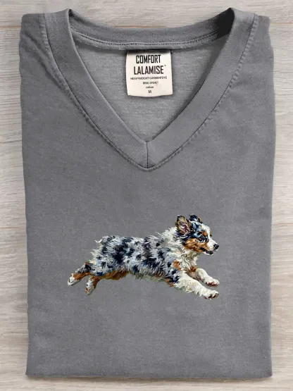 Funny Retro Cute Running Dog Art Print V-neck Casual T-shirt