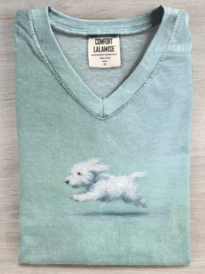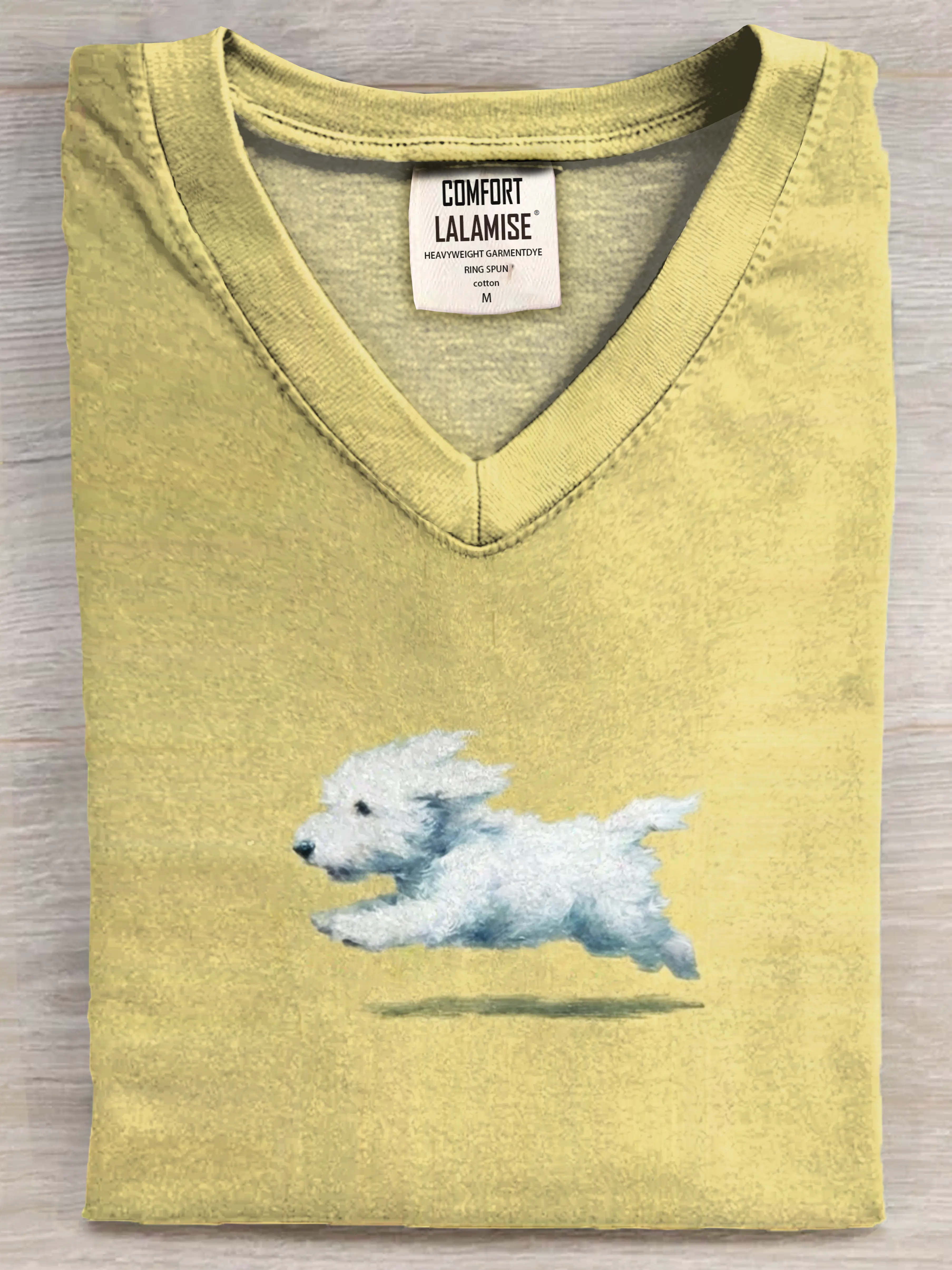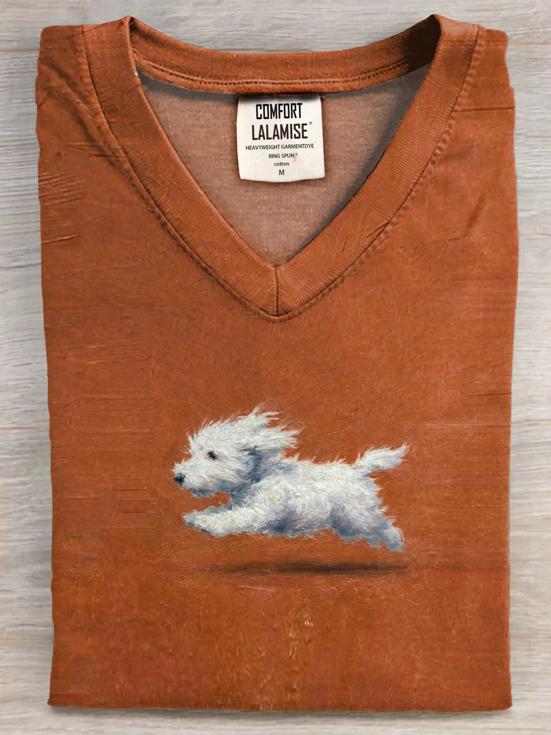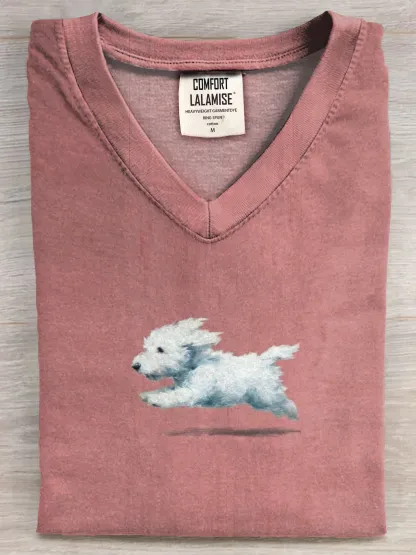 Funny Retro Cute Running White Dog Art Print V-neck Casual T-shirt