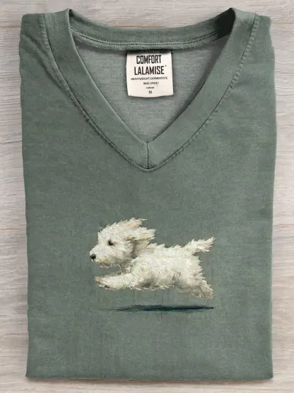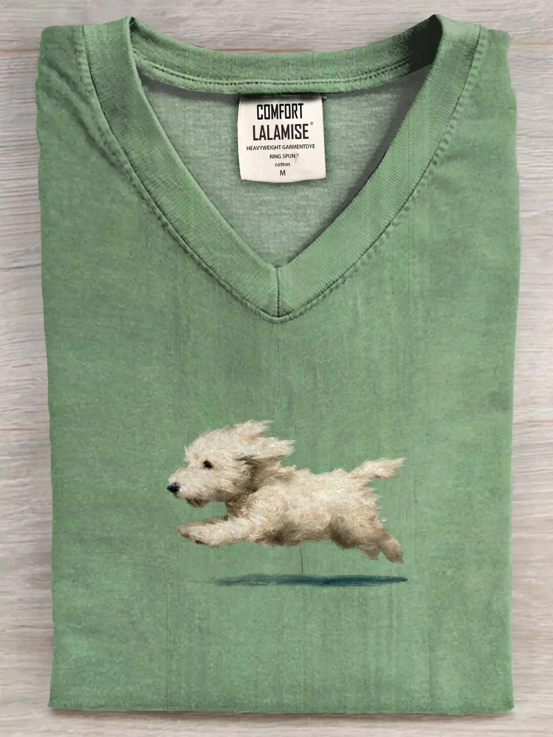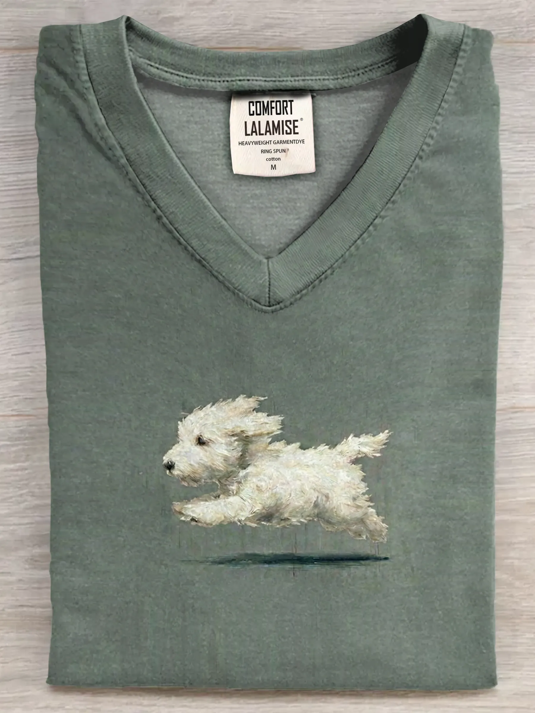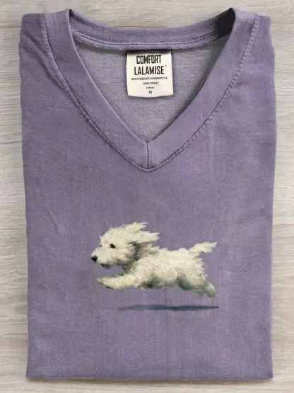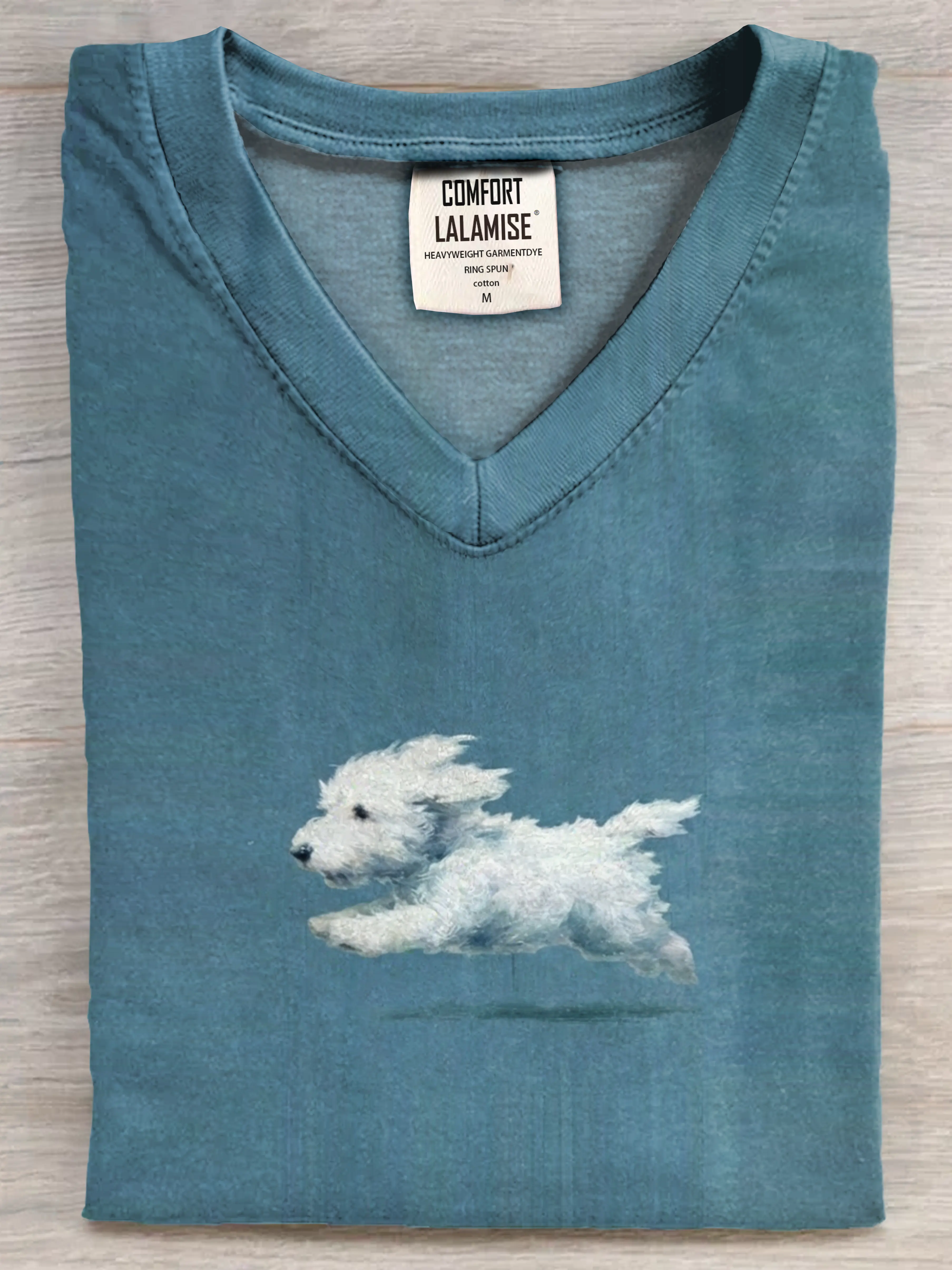 Funny Retro Cute Running White Dog Art Print V-neck Casual T-shirt