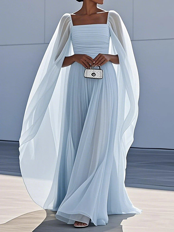 Gauze Pleated Split-Joint Cape Square-neck Maxi Dresses Evening Dresses