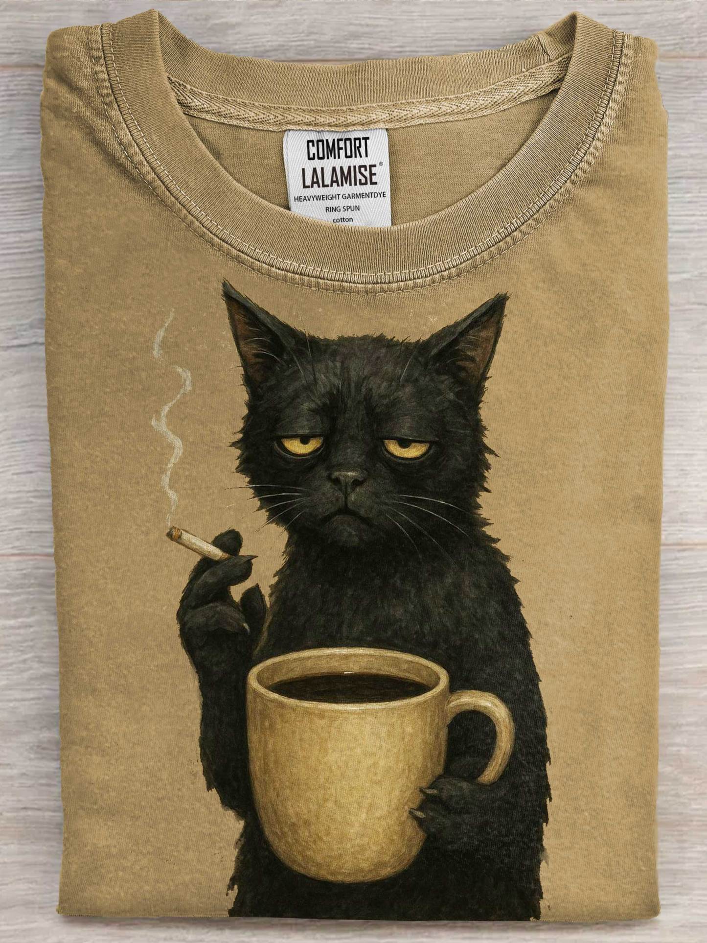 Good Morning Black Cat Funny Art Print Causal Cotton Short Sleeve T-shirt