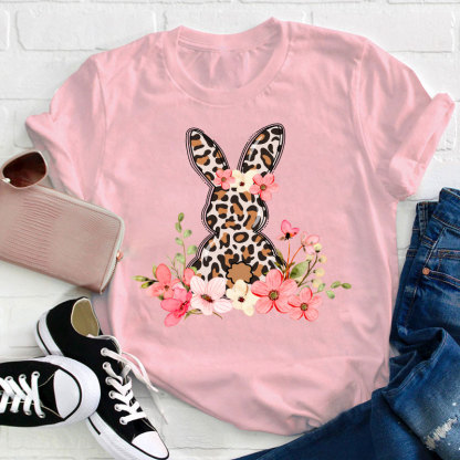 Leopard Floral Bunny Teacher T-Shirt