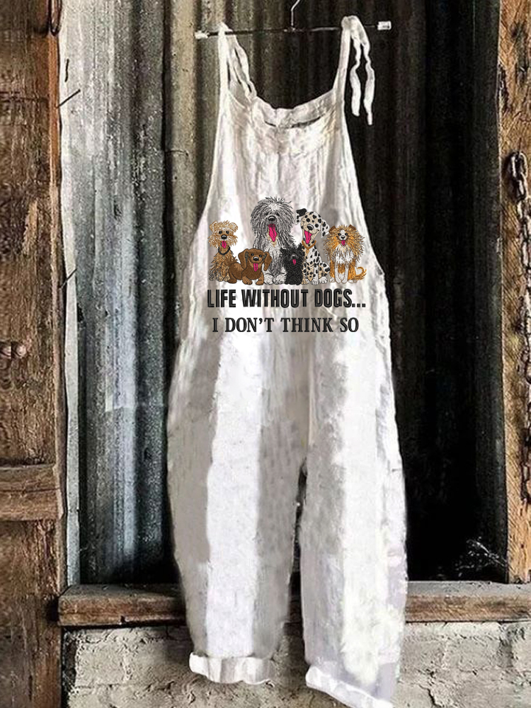 Life Without Dogs Embroidery Pattern Linen Blend Jumpsuit