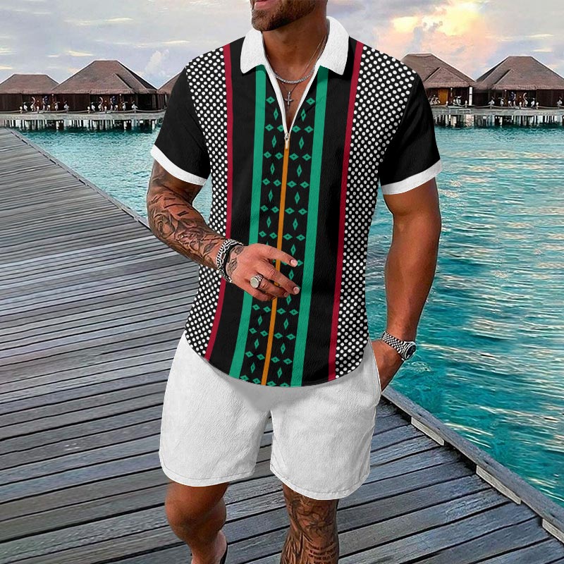 Men's Casual Fashion Polka Dot Striped Splicing Art Printed Short-sleeved Zipper Polo Set
