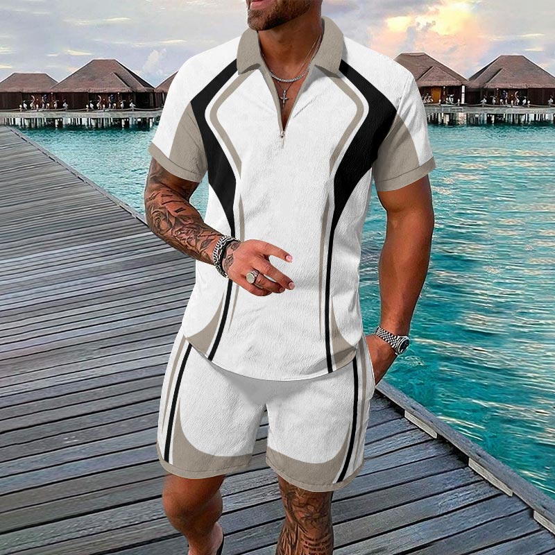 Men's Casual Geometric Line Art Printed Short-sleeved Zipper Polo Set
