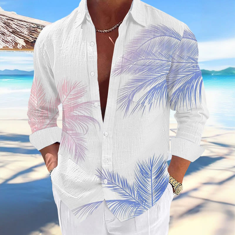 Men's Casual Hawaiian Palm Tree Print Long Sleeve Pocket Shirt