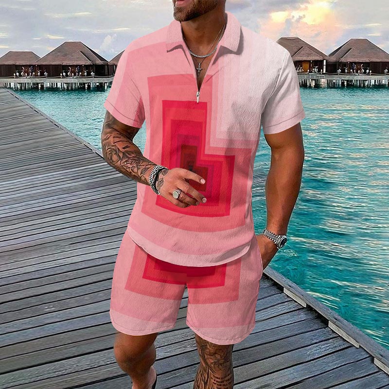 Men's Casual Pink Ombre Geometric Print Short-sleeved Polo Set