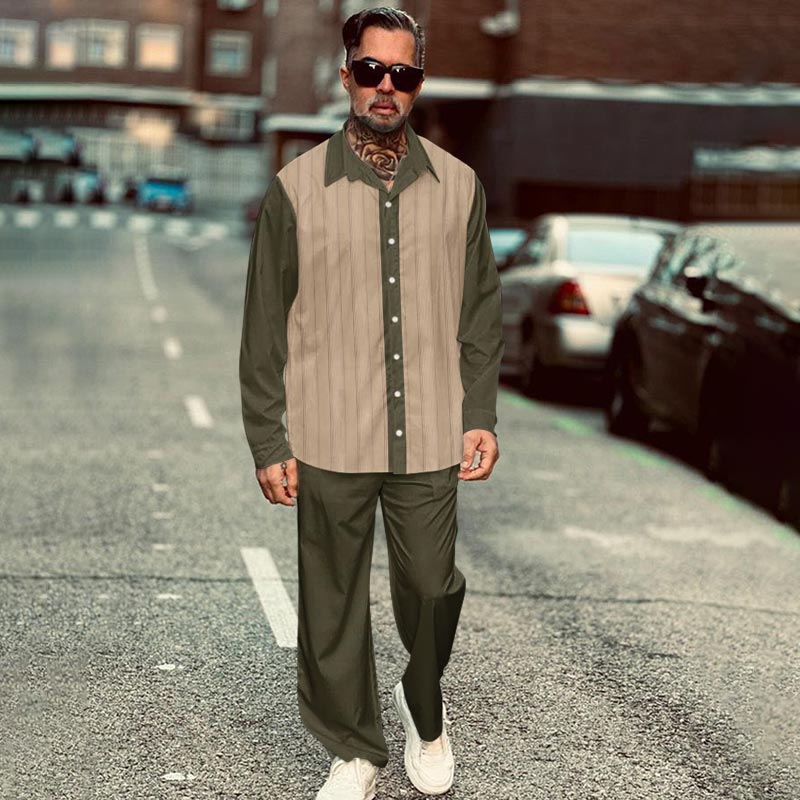 Men's Casual Simple Color Block Stripe Print Long Sleeve Shirt Set
