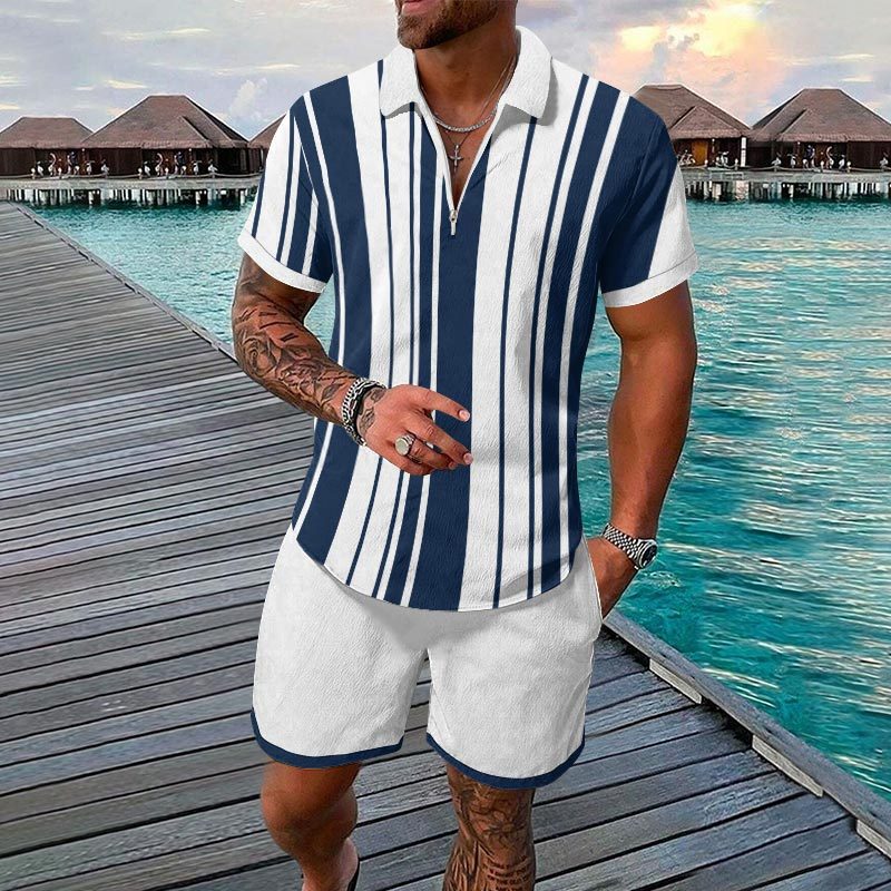 Men's Simple Stripe Design Print Short Sleeve Polo Set