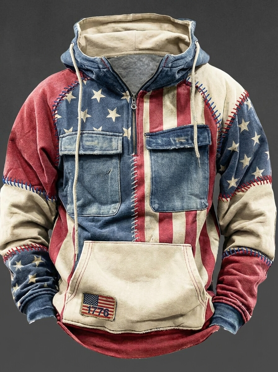 Men's 1776 American Flag Patchwork Art Print Half Zip Three Pockets Hoodie
