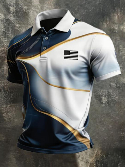 Men's Abstract Lines American Flag Printed Short Sleeve Polo Shirt