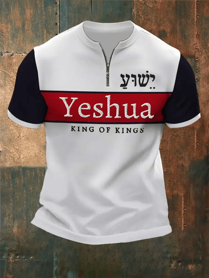 Men's Bible Verse “ Yeshua King OF Kings Lord Of Lords” Printed Zip Short Sleeve T-Shirt