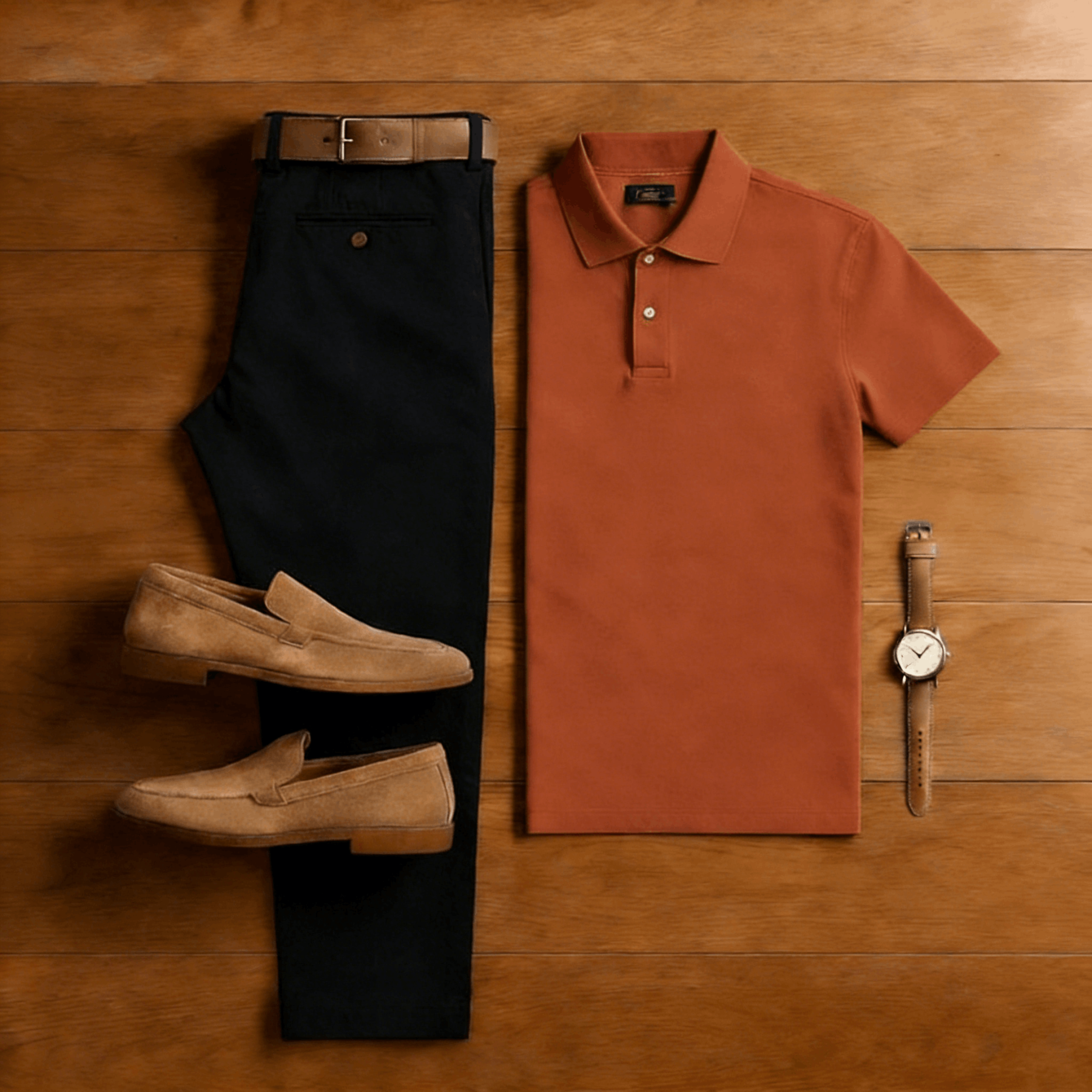 Men's Casual Red Brown & Black Solid Color Matching Sport Short Sleeved Polo Shirt & Trousers Two-Piece Set