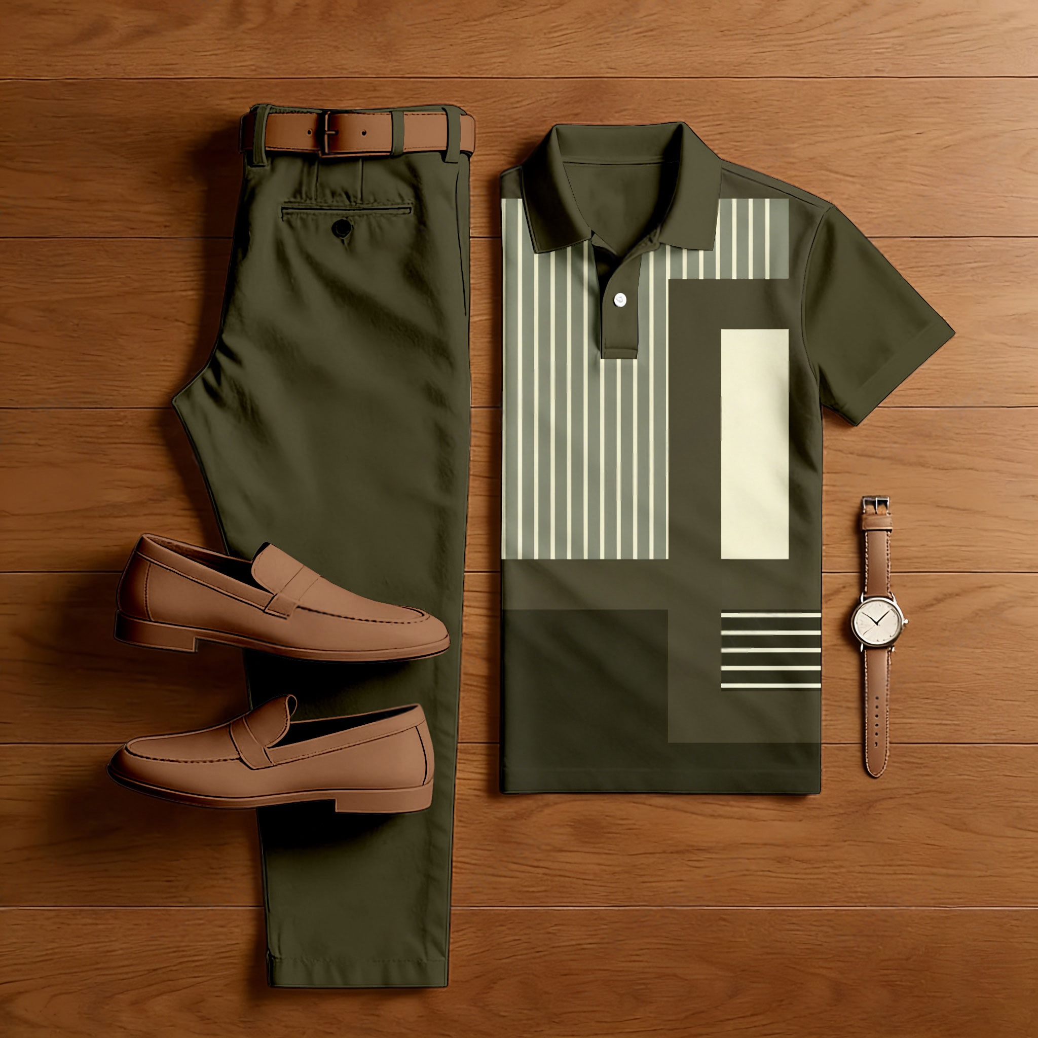 Men's Casual Army Green Color Matching Geometric Printed Short Sleeved Polo Shirt & Trousers Two-Piece Set