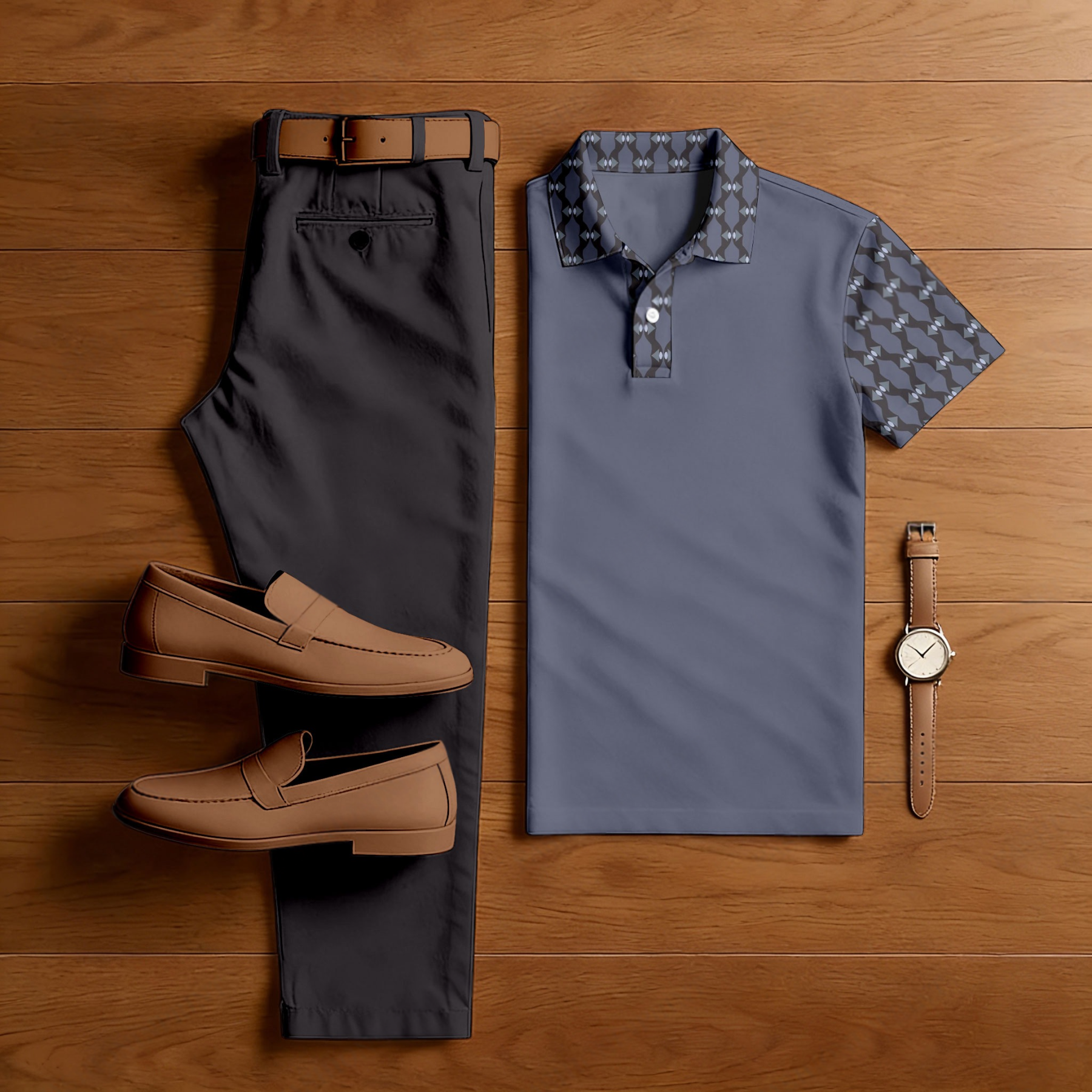 Men's Casual Black & Purple Gray Color Matching Checkered Printed Short Sleeved Polo Shirt & Trousers Two-Piece Set
