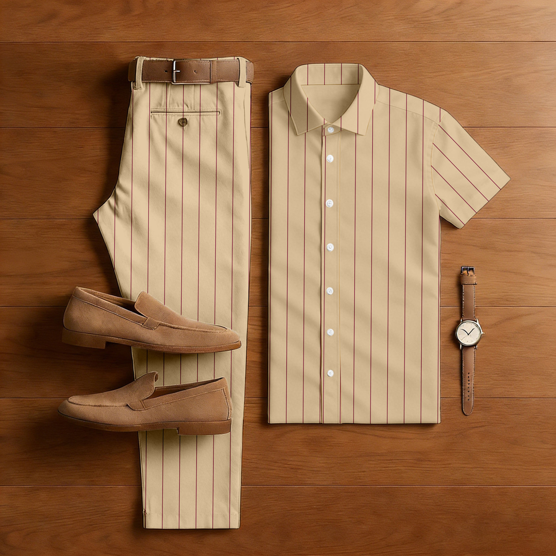 Men's Casual Tan & Red Color Matching Striped Print Short-Sleeve Shirt & Trousers Two-Piece Set