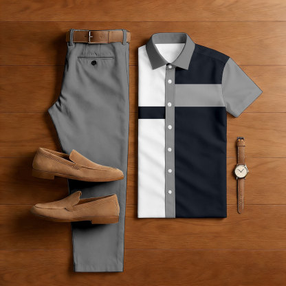 Men's Casual Black & Gray Color Matching Geometric Print Short-Sleeve Shirt & Trousers Two-Piece Set