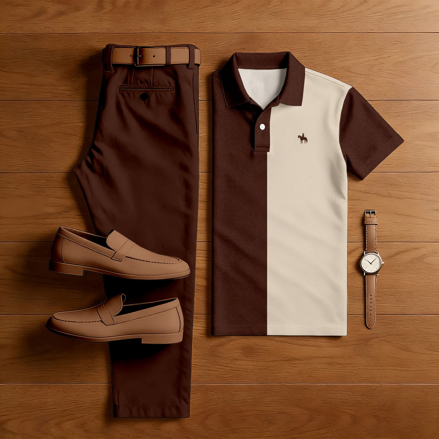 Men's Casual Apricot & Coffee Color Matching Printed Short Sleeved Polo Shirt & Trousers Two-Piece Set