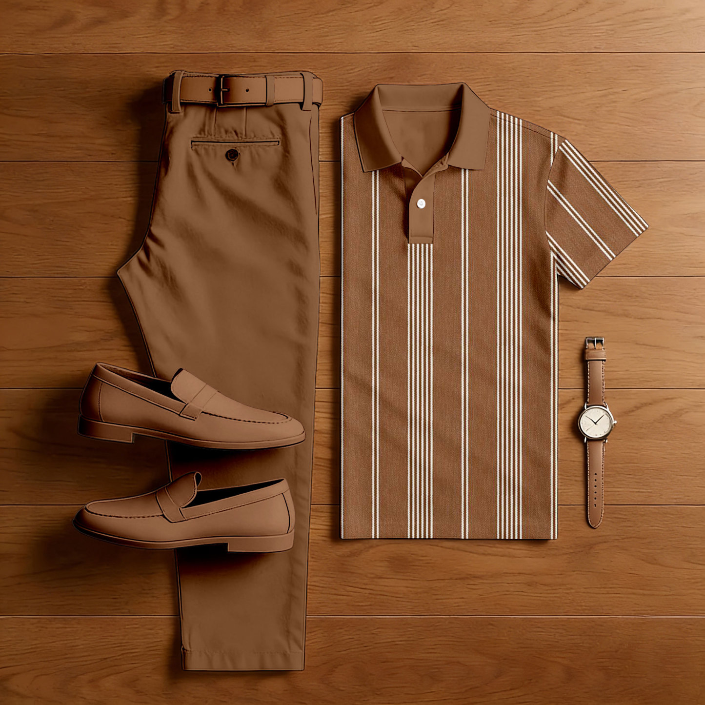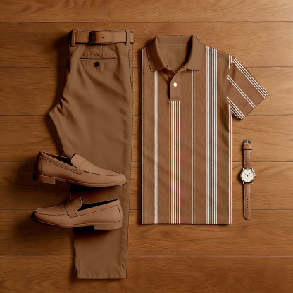 Men's Casual Brown & White Color Matching Striped Printed Short Sleeved Polo Shirt & Trousers Two-Piece Set
