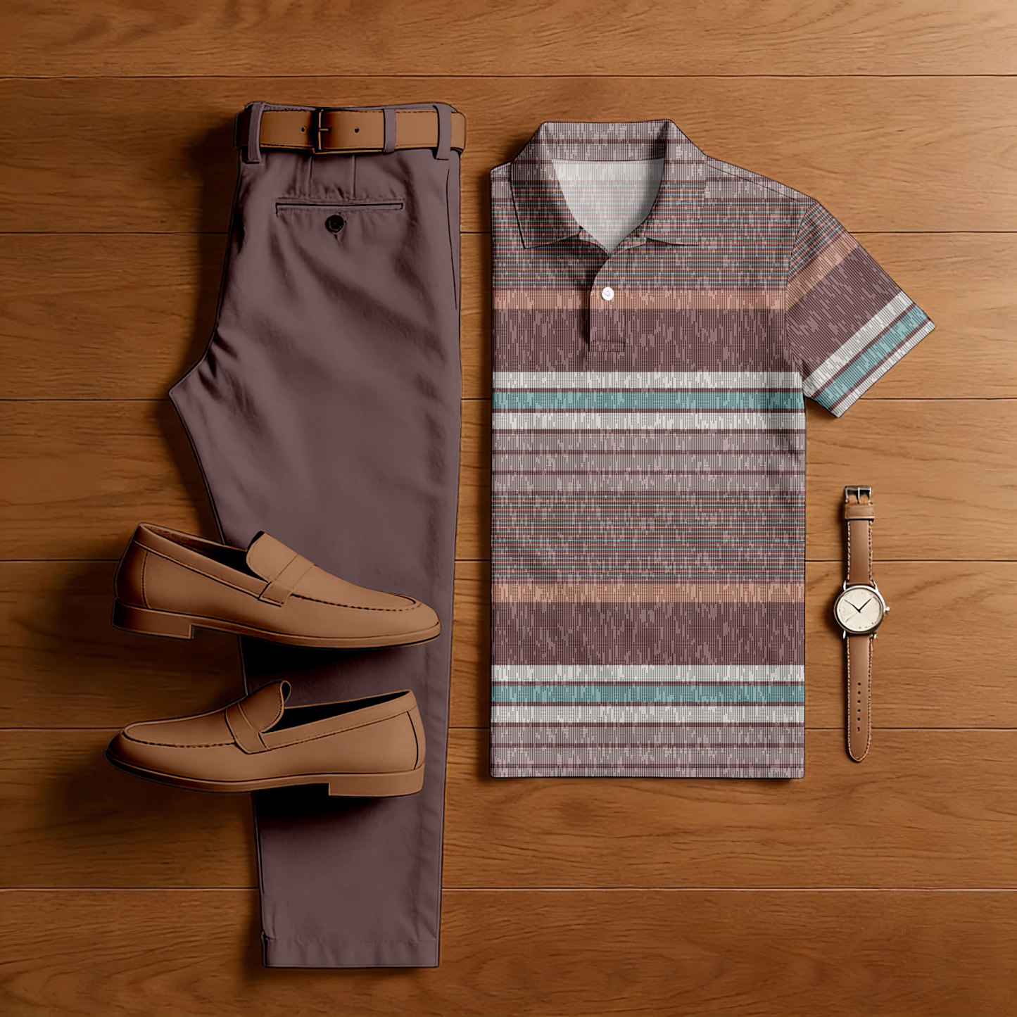 Men's Casual Red Brown & Multi Color Matching Striped Printed Short Sleeved Polo Shirt & Trousers Two-Piece Set