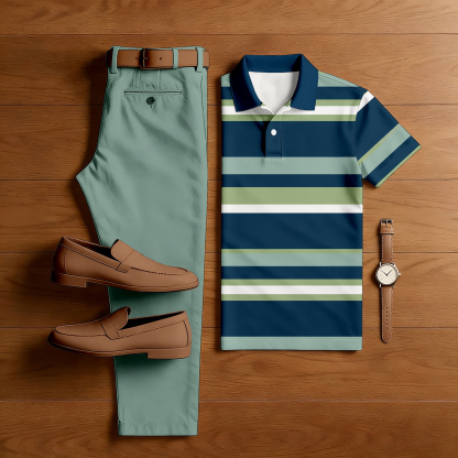 Men's Casual Navy Blue & Green Color Matching Striped Printed Short Sleeved Polo Shirt & Trousers Two-Piece Set