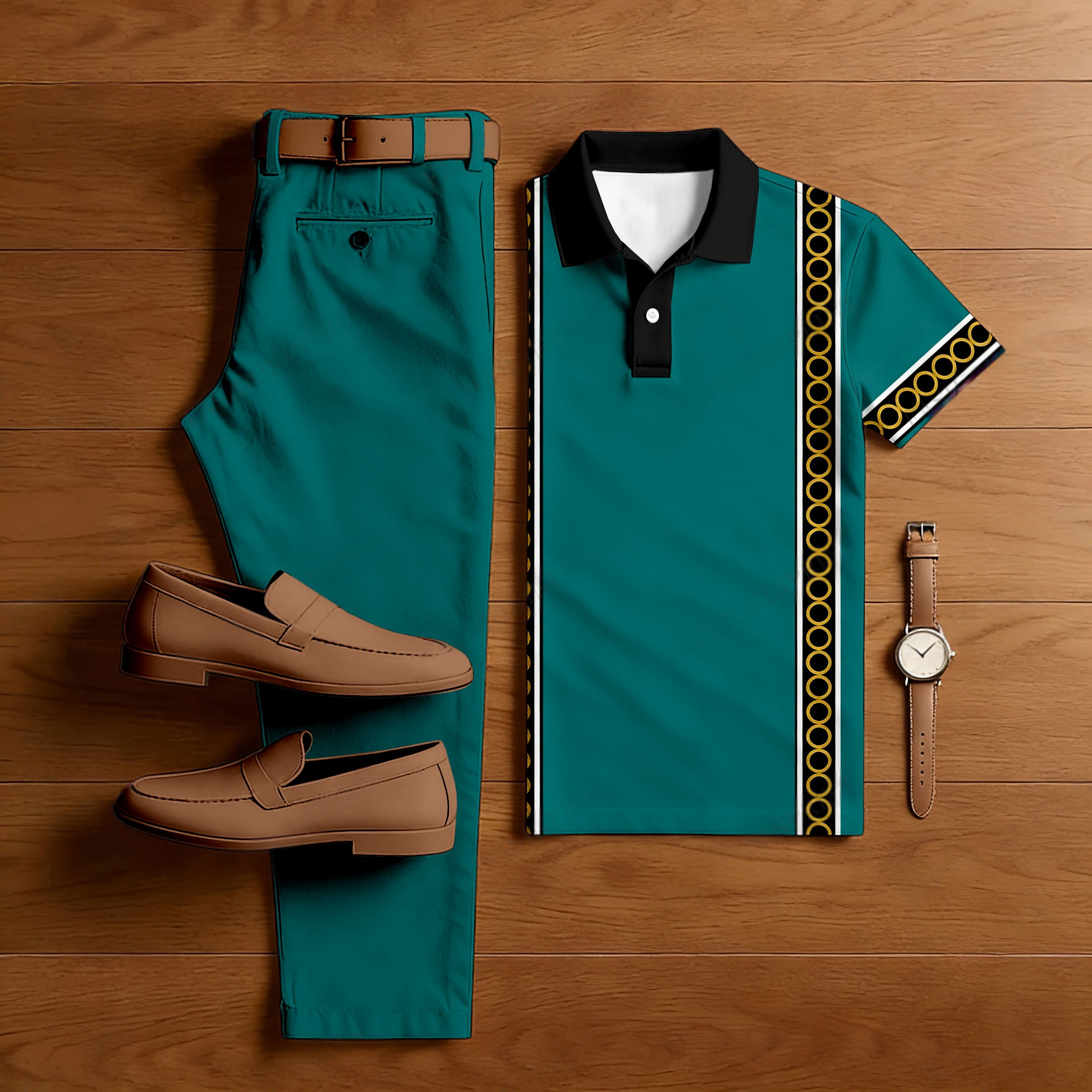Men's Casual Green & Black Color Matching Retro Style Printed Short Sleeved Polo Shirt & Trousers Two-Piece Set