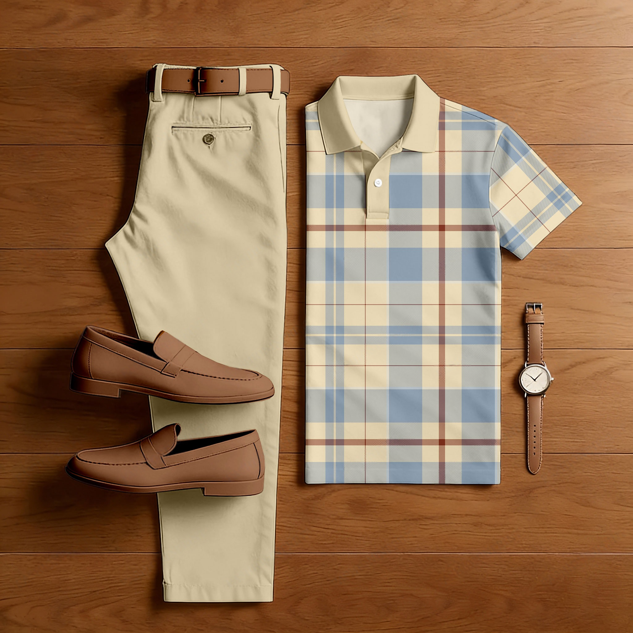 Men's Casual Blue & Yellow Khaki Color Matching Checkered Printed Short Sleeved Polo Shirt & Trousers Two-Piece Set