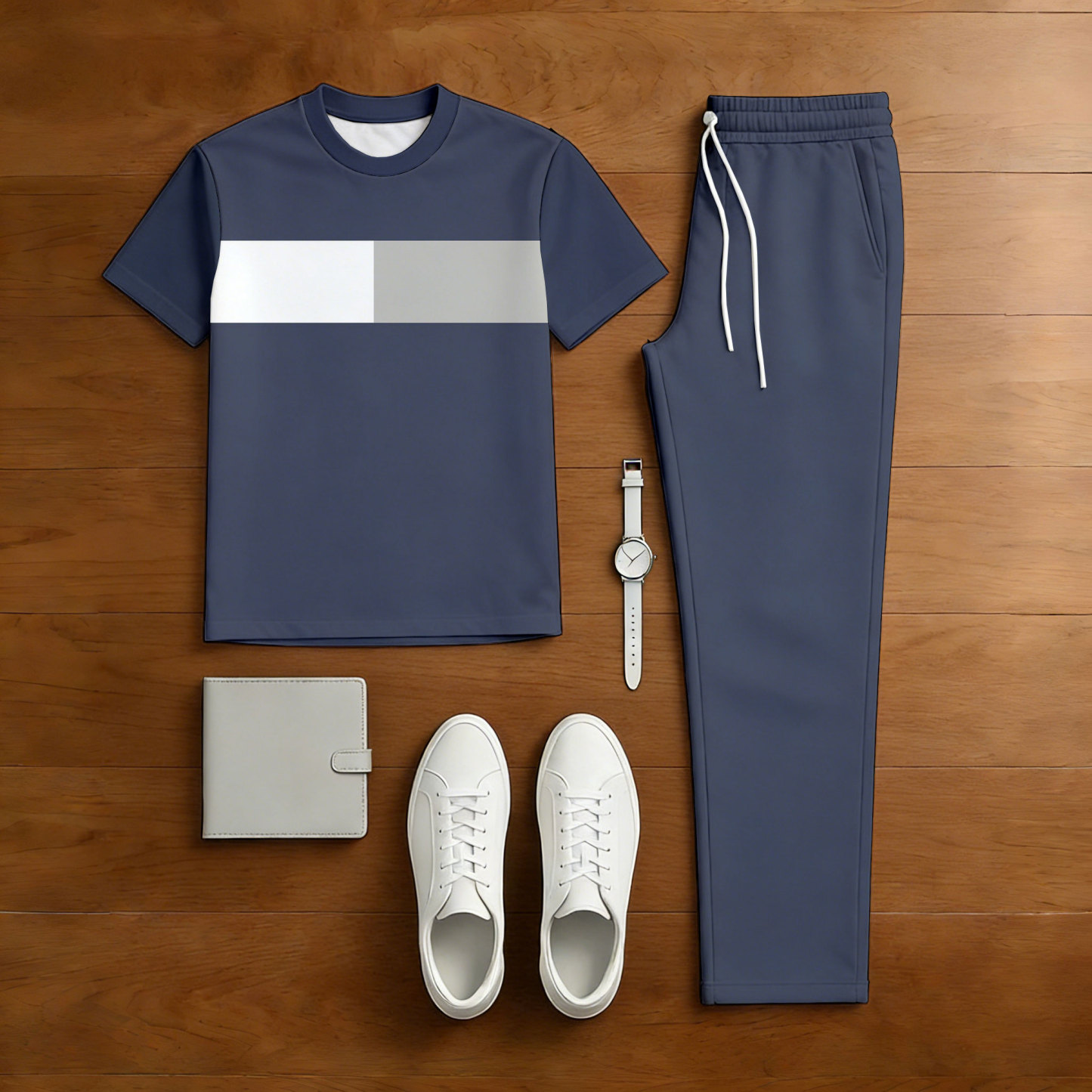 Men's Casual Navy Blue Color Matching Printed Short Sleeved T-Shirt & Trousers Two-Piece Set