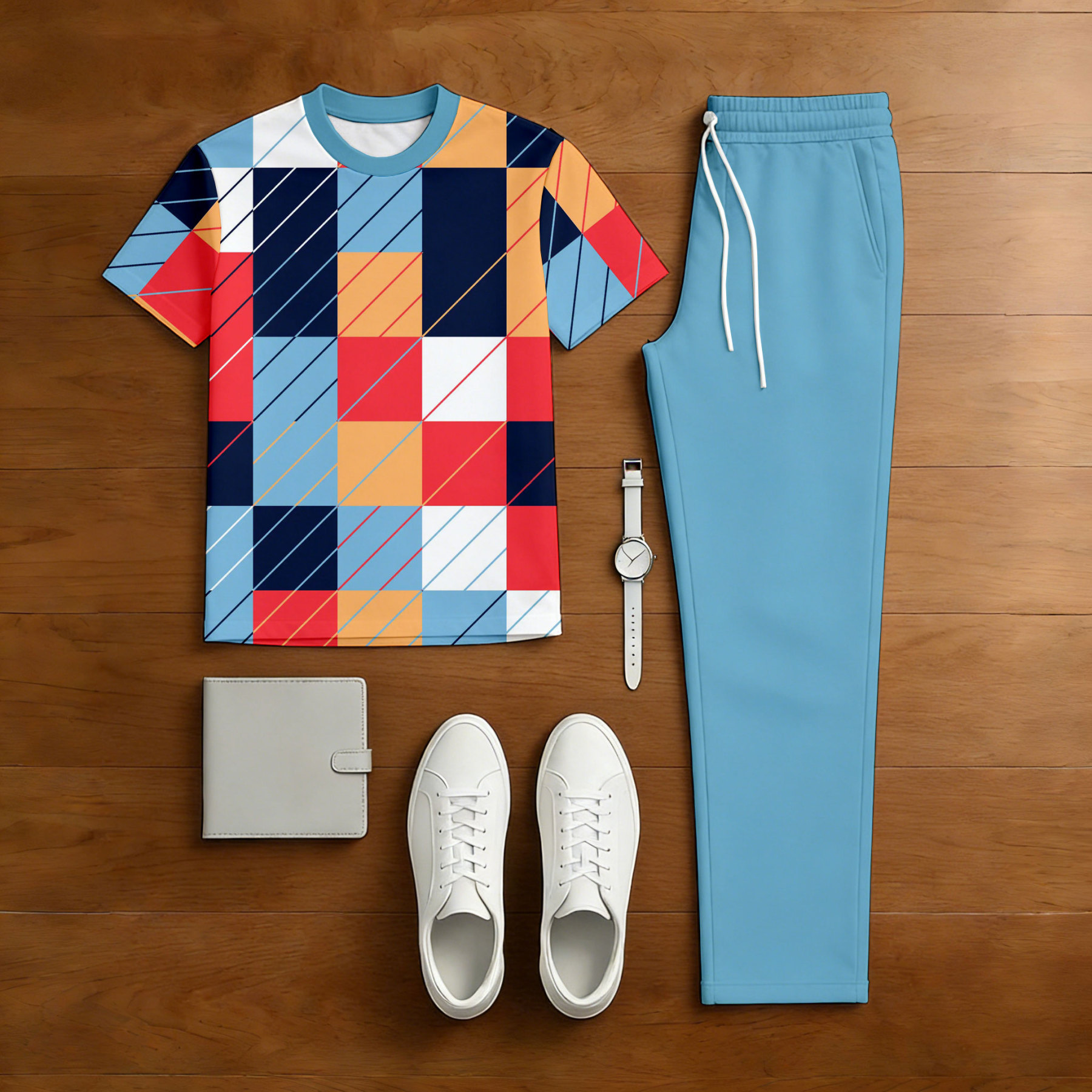 Men's Casual Blue & Multi Color Matching Checkered Printed Short Sleeved T-Shirt & Trousers Two-Piece Set