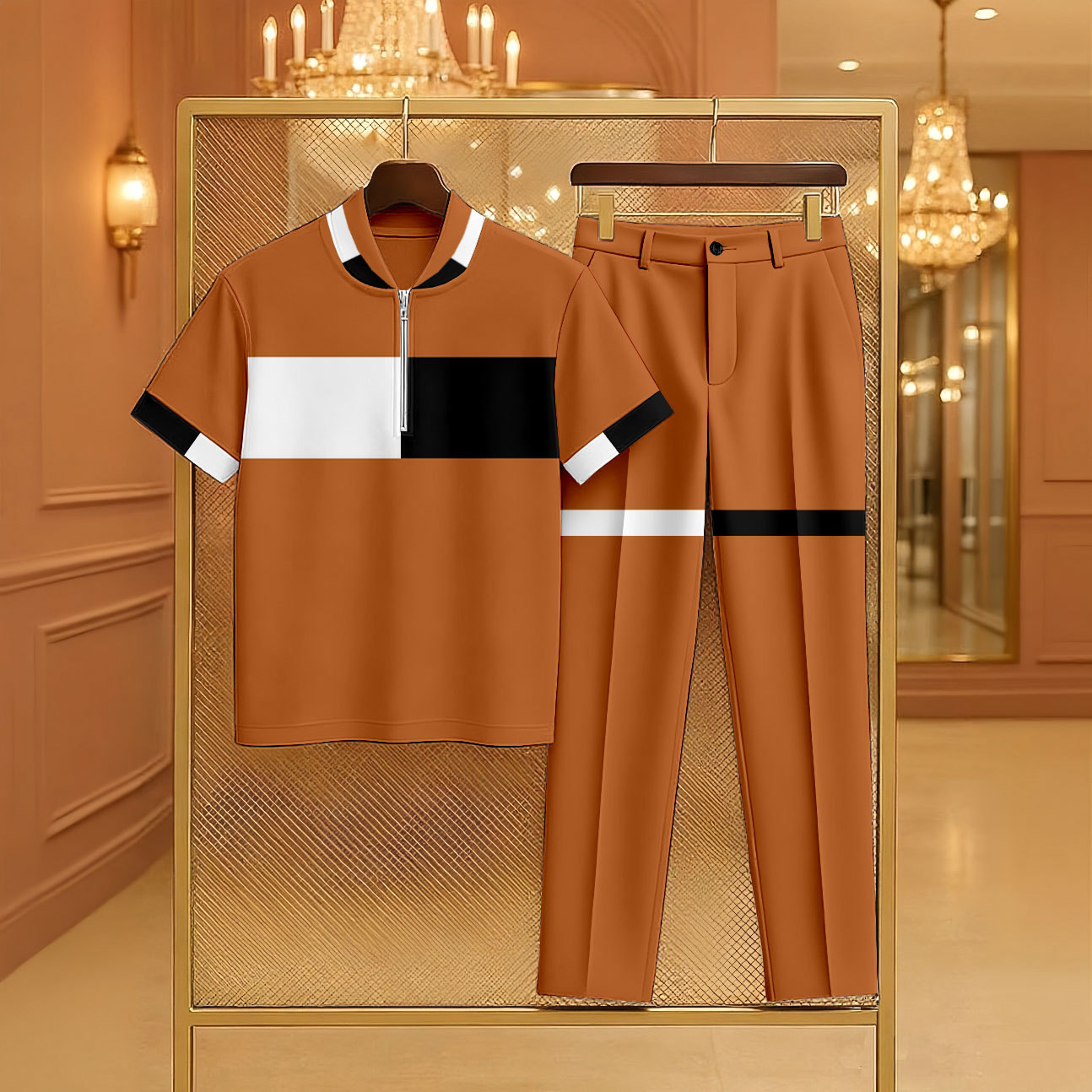 Men's Casual Black & White Color Matching Geometric Printed Zipper Short Sleeved Polo Shirt & Trousers Orange Two-Piece Set