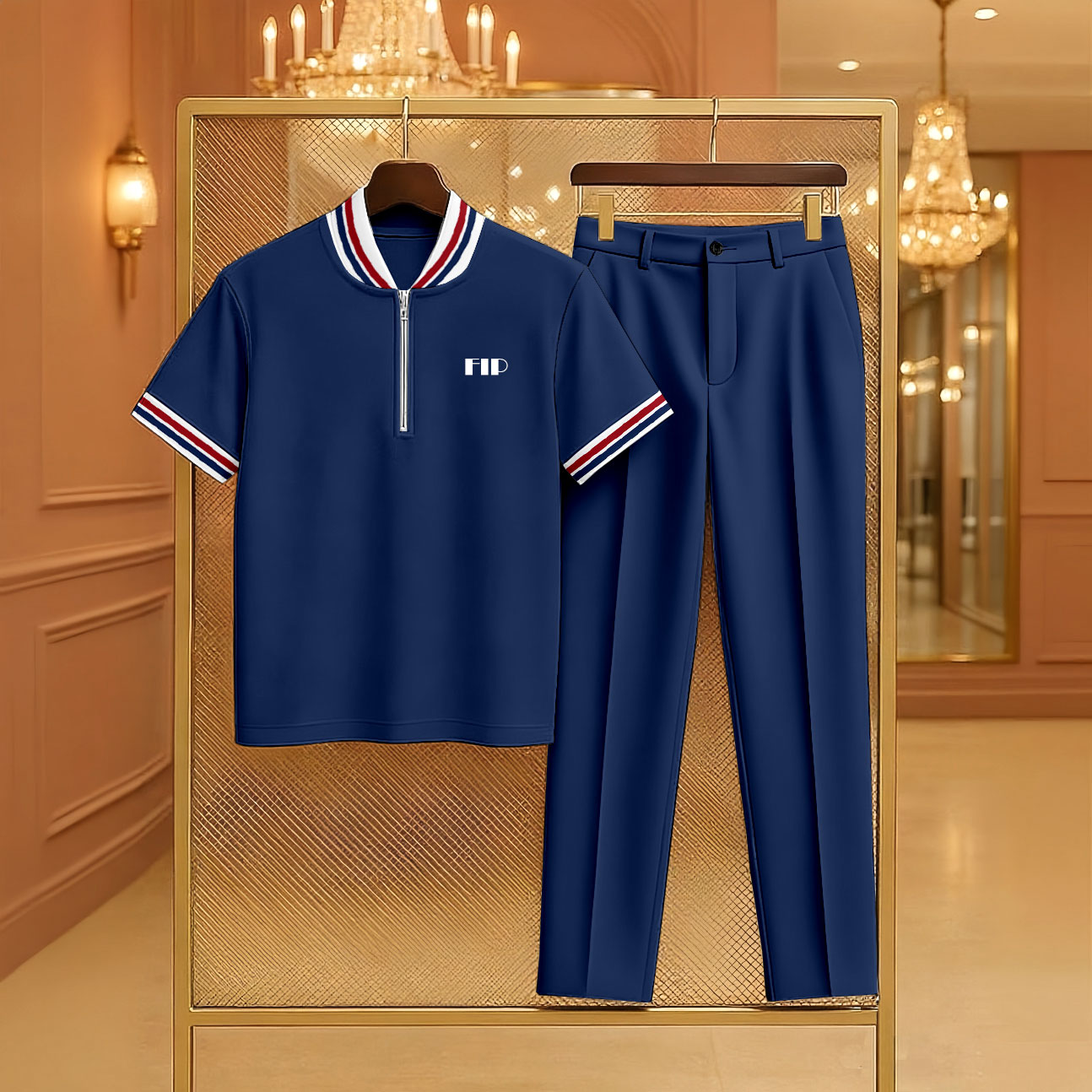 Men's Casual Navy Blue Color Matching Printed Zipper Short Sleeved Polo Shirt & Trousers Two-Piece Set