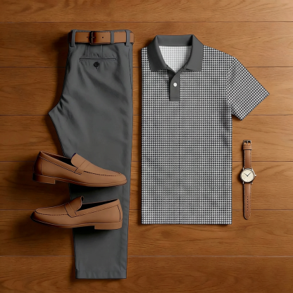 Men's Casual Gray Plaid Print Short-Sleeved Polo Shirt And Trousers Two-Piece Set