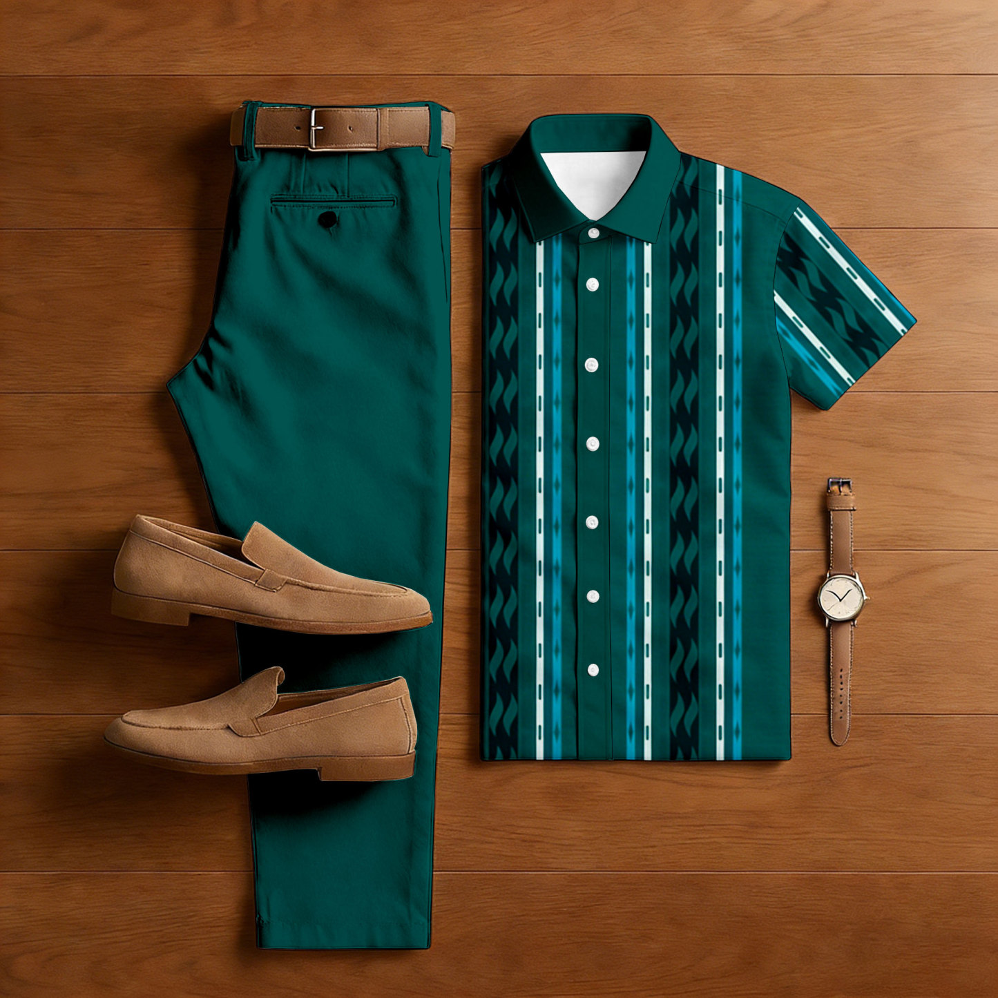 Men's Casual Green Color Matching Striped Print Short-Sleeve Shirt & Trousers Two-Piece Set